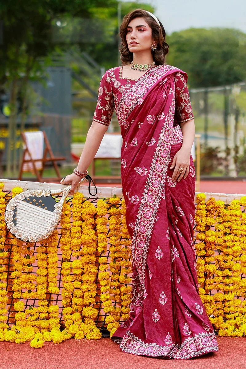Draped in elegance, this magenta saree is crafted from soft medium silk and adorned with timeless block print detailing. It is paired with a raw silk blouse, hand-embellished to perfection and cut in a flattering sweetheart neckline with short sleeves. The luxurious textures and refined craftsmanship make this ensemble a statement of modern sophistication rooted in tradition.
