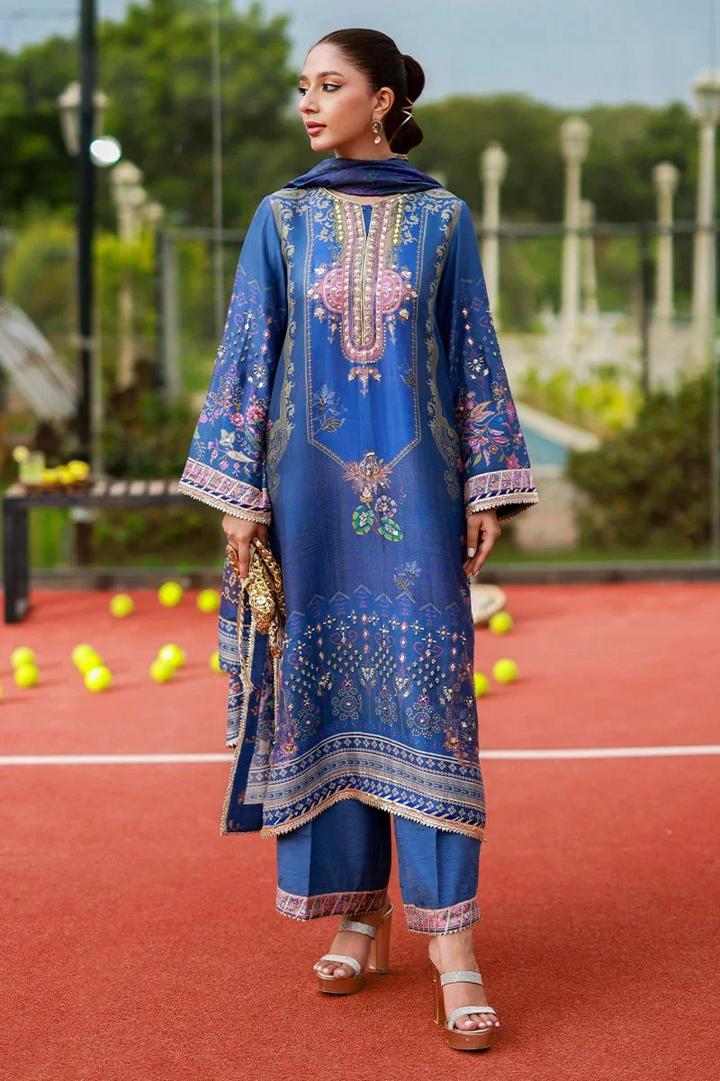 A refined blue raw silk shirt adorned with exquisite zardozi, nakshi, and gota handwork, showcasing timeless craftsmanship. It is paired with a tailored Korean silk izaar for a graceful silhouette and completed with a flowing medium silk printed dupatta featuring delicate gota detailing. An elegant blend of tradition and modern sophistication.