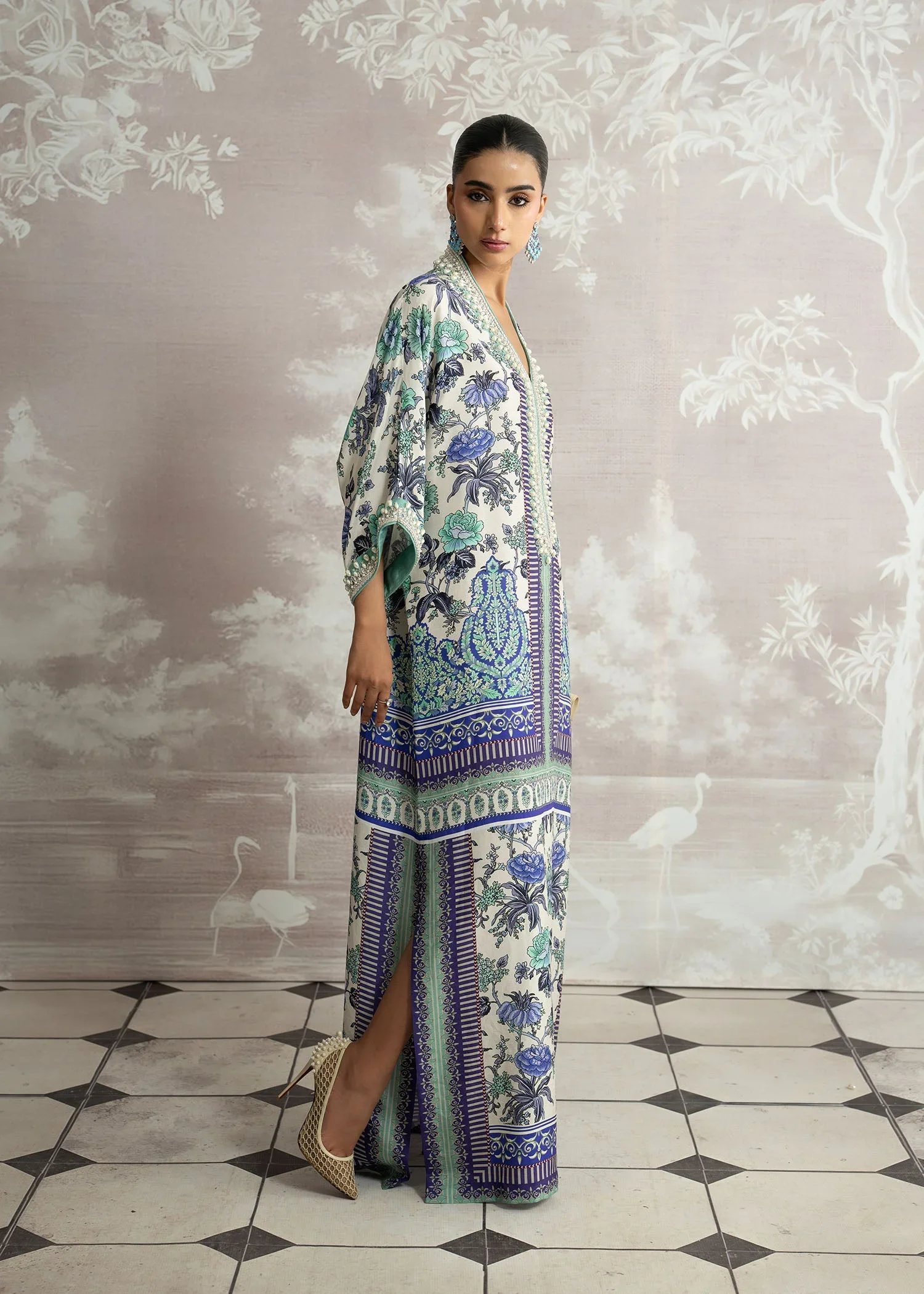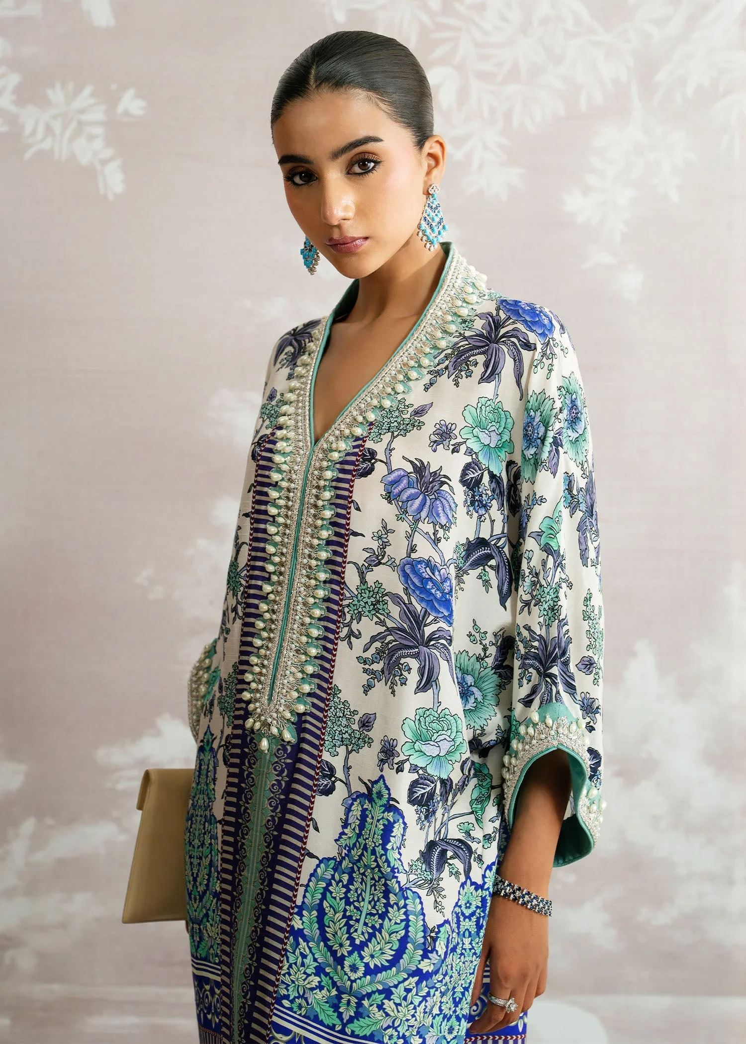 An expression of effortless luxury, Bahar blooms in exquisite printed Korean silk, capturing the essence of refined elegance. The hand-embellished neckline adds a touch of artisanal brilliance, beautifully complemented by a graceful plain spray dupatta. A Luxury Pret ensemble designed to move seamlessly from day to evening, where modern charm meets timeless sophistication.