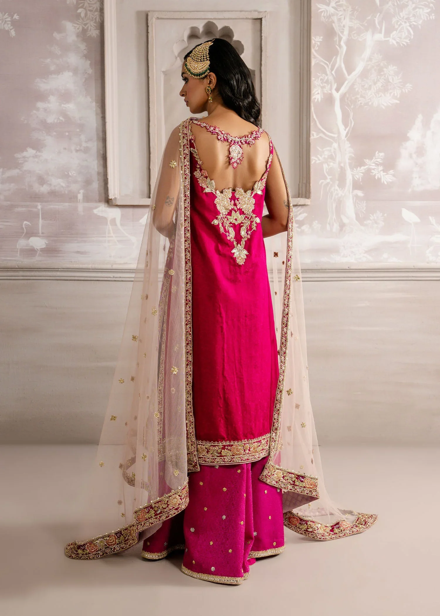 In a striking blend of red and pink, Crimson Garden exudes vibrant elegance and contemporary flair. The jamawar long shirt paired with matching jamawar trousers creates a regal and structured silhouette, while the net dupatta options — as shown, plain, or spray — allow for versatile styling and graceful layering. A look designed to radiate modern sophistication with a touch of luxe charm.