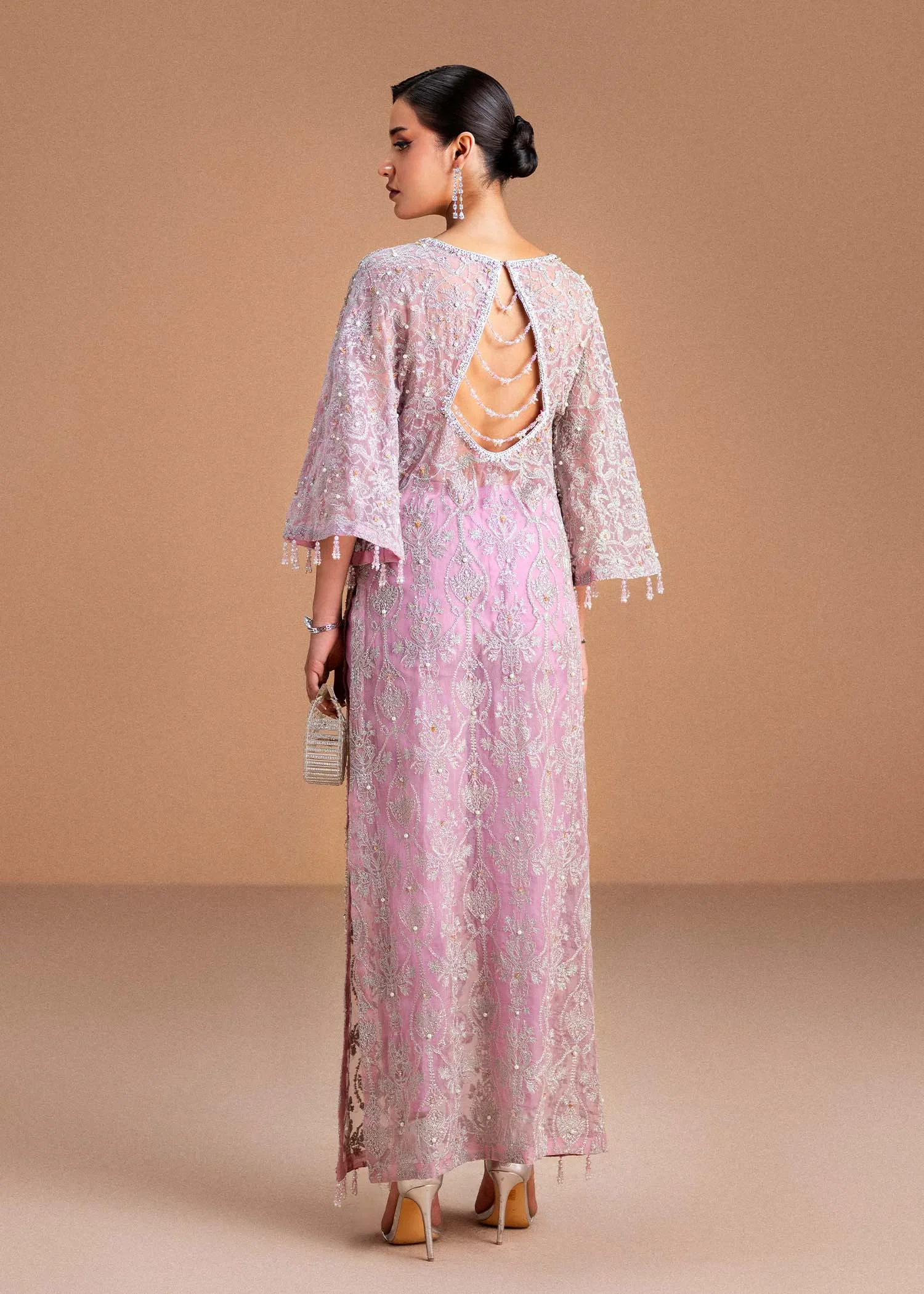 Embrace timeless elegance with the Dina Orchid Ensemble by Kanwal Malik, a refined statement of luxury and modern sophistication. The Kathan organza shirt is fully embroidered and delicately hand-embellished, creating a graceful, couture-inspired look. The design is elevated with slit bell sleeves, adding a soft, flowing flair that enhances movement and femininity.