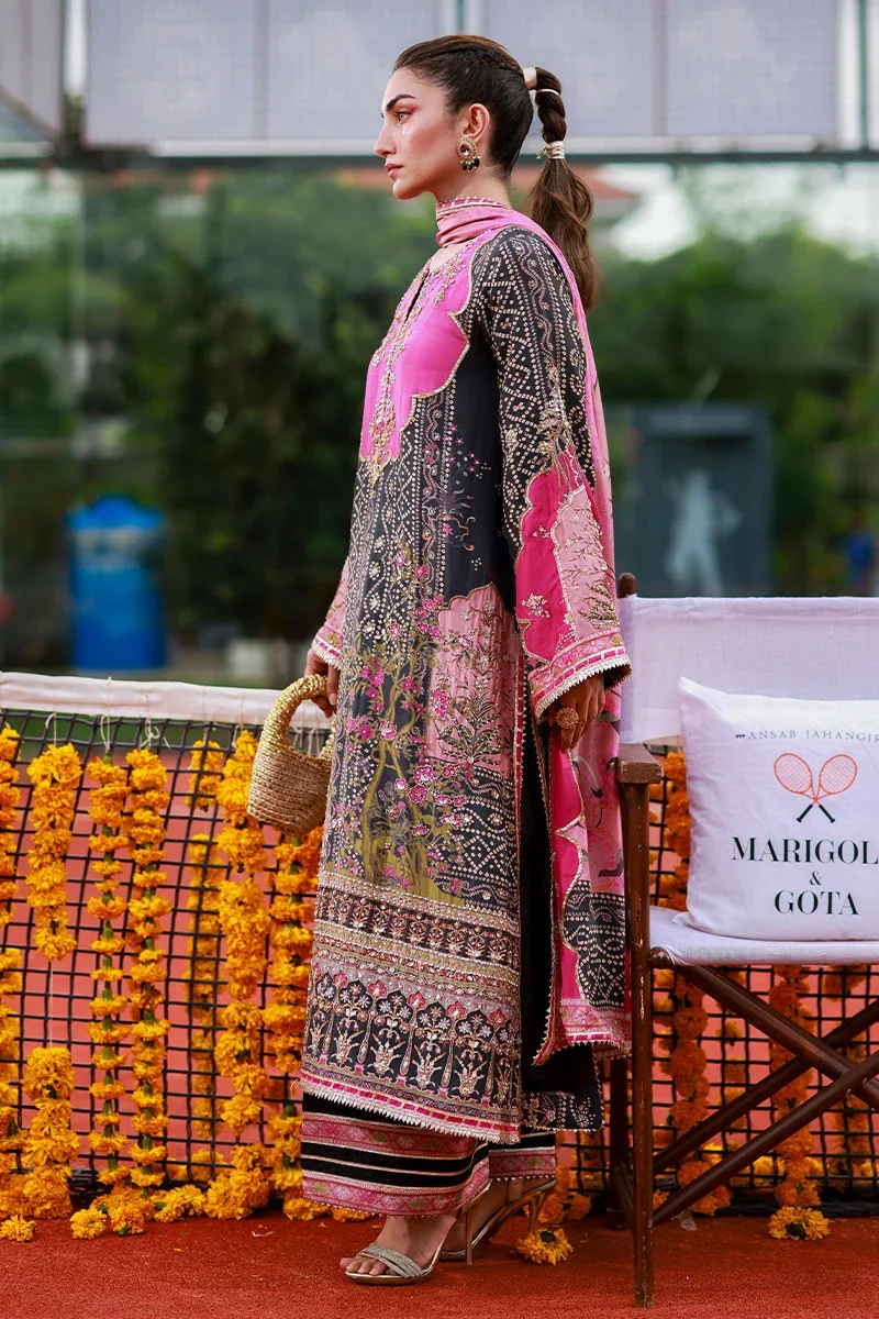 A timeless black chunri print shirt enhanced with pink color block accents and intricate hand embellishment along the neckline, sleeves, and daman. Scattered sequins add a subtle shimmer across the shirt and dupatta, while gota lace detailing lends a festive charm. Paired with a medium silk crushed Dhaka finished with delicate lace, this ensemble is a perfect balance of tradition and contemporary elegance.