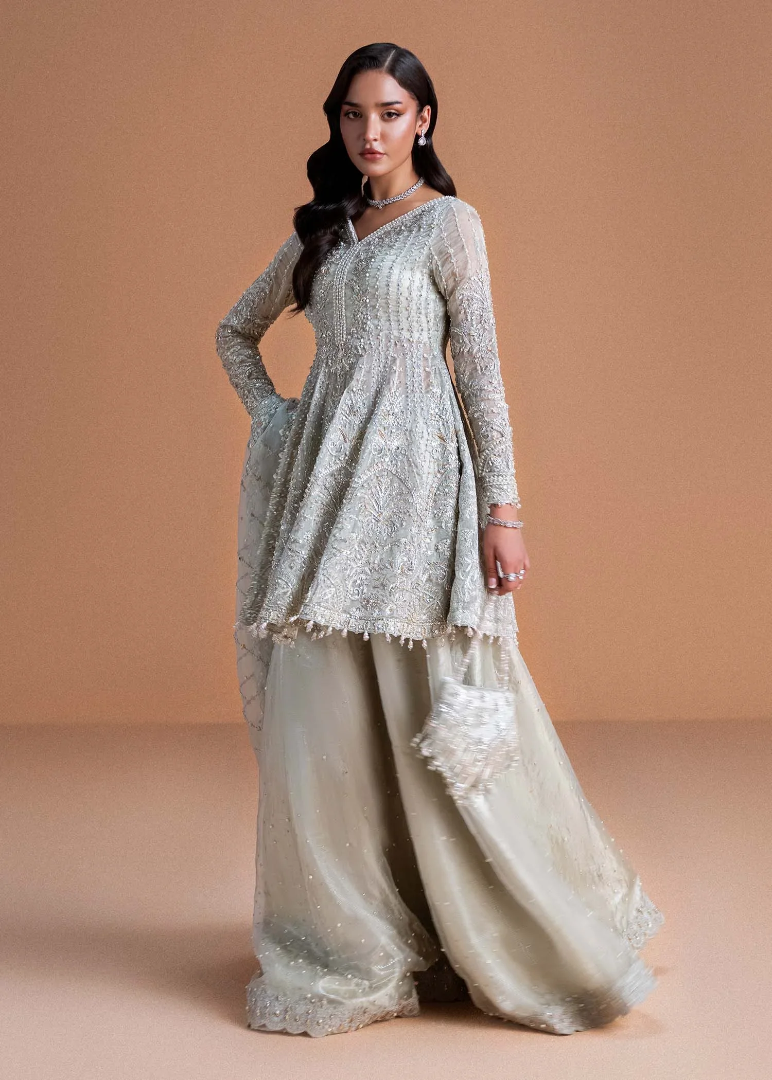 Radiate refined elegance with Mahira by Kanwal Malik, a sophisticated moonlit silver peplum ensemble designed for modern glamour and timeless appeal. The sleek tissue peplum shirt features tailored sleeves and is lavishly adorned with intricate embroidery and delicate ada work, creating a luminous texture with a subtle, graceful sheen.