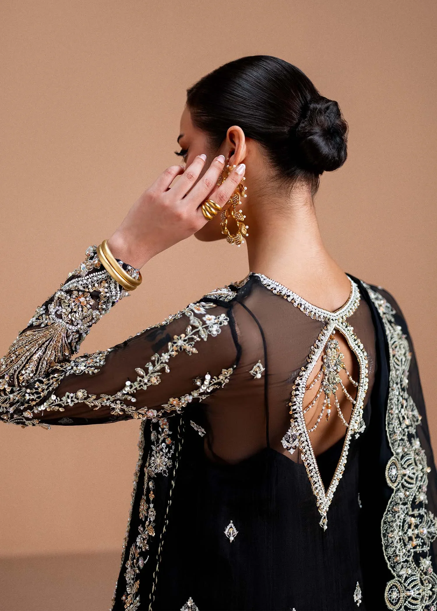 Make a powerful style statement with Rayen by Kanwal Malik, a bold and elegant black formal ensemble designed for unforgettable entrances. The high-slit straight shirt, crafted from luxurious Kathan organza, is accented with criss-cross doori tassels along the side slits, adding a playful yet edgy detail.