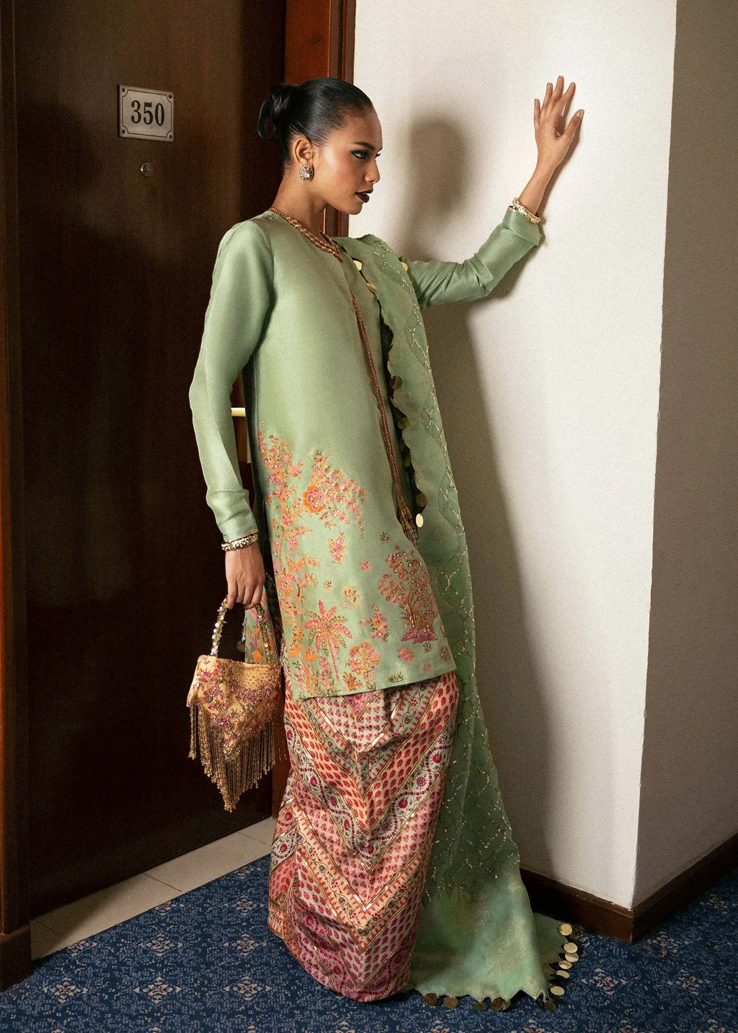 Paired with a multi-head organza dupatta, the ensemble gains a touch of ethereal lightness and graceful movement. The digital-printed raw silk shalwar, enhanced with exquisite gotta line detailing, introduces a striking contrast while maintaining cohesive elegance. Perfect for festive occasions, evening events, or celebratory gatherings, Viridity is a masterful blend of artistry, luxury, and modern charm, designed to leave a lasting impression.