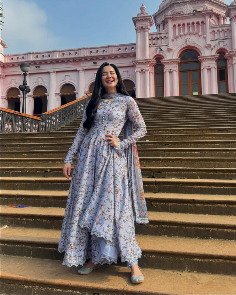 “Ataliah” captures the essence of regal sophistication and timeless allure. Crafted from luxurious silk, the printed and embroidered pishwas reflects exquisite craftsmanship and graceful charm. Paired with a sleek silk churidaar for a refined silhouette, the look is completed with a soft chiffon dupatta that adds an ethereal touch. A harmonious blend of tradition and modern elegance, Ataliah is perfect for festive gatherings and formal celebrations.