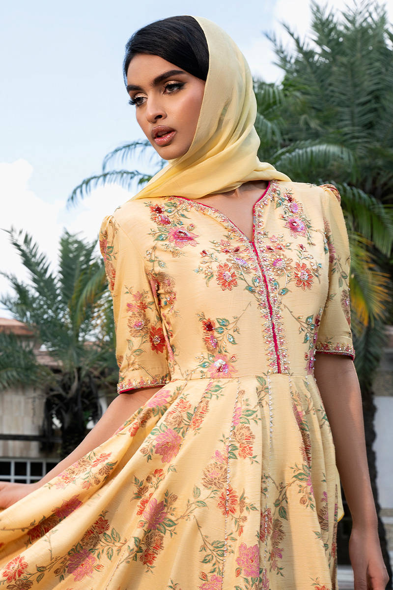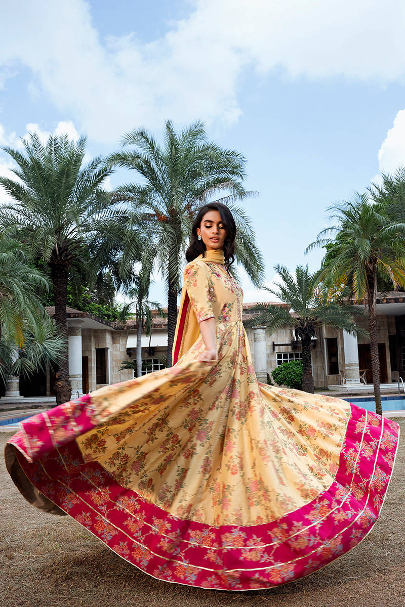 Butter Bloom is an ethereal Zainab Salman classic—crafted in screen-printed raw silk in a graceful kalidar silhouette. The design features an intricately hand-embellished bodice, paired with sophisticated Indian-style sleeves and contrasting pink printed borders that add a soft, feminine charm. The look can be completed with straight pants in a matching hue and a luxurious silk dupatta, making it a perfect blend of timeless elegance and contemporary grace.