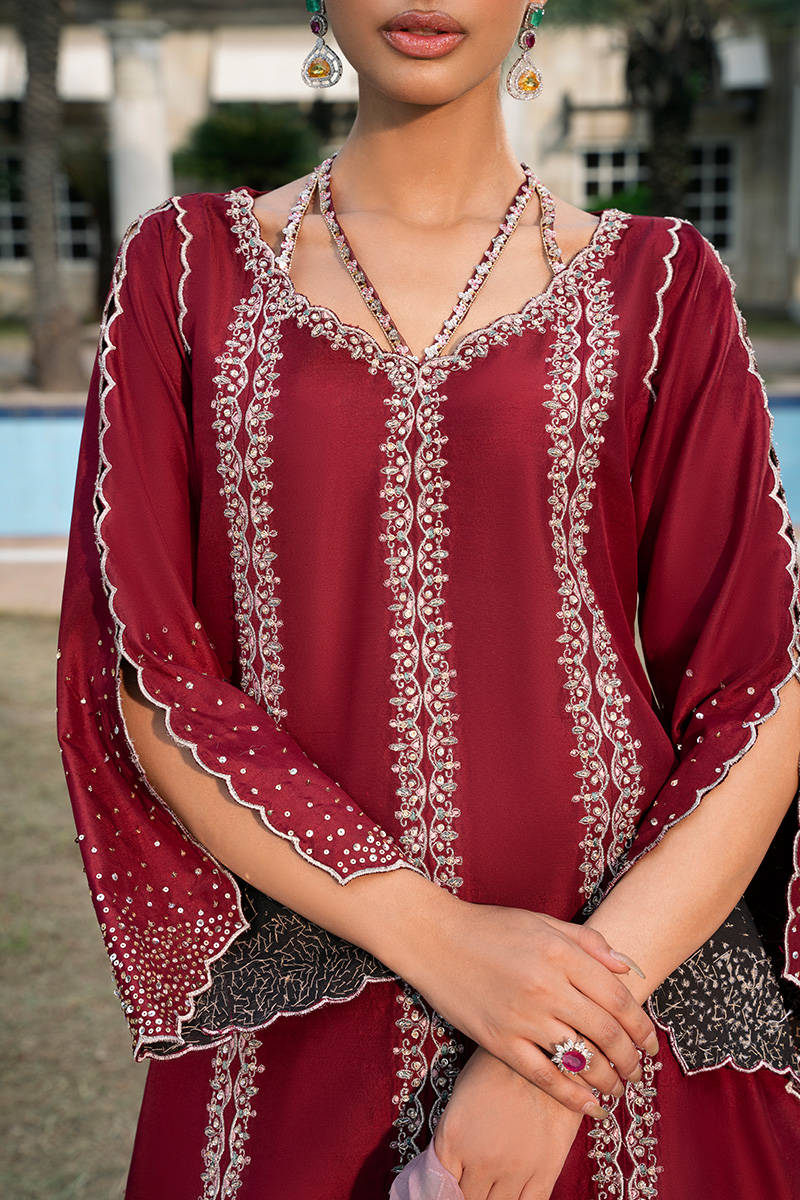 Cherry Muse is crafted from pure raw silk, featuring delicately embroidered panels adorned with intricate hand embellishments. The neckline is enhanced with detailed embellishments, while the sleeves make a statement with dramatic handwork and scalloped edges finished with shimmering sequins. Paired with contrasting mustard, extra-flared pants finished with gota detailing, the look exudes modern elegance. The outfit is completed with a stunning ombré silk scarf, adding the perfect feminine touch to elevate the ensemble.