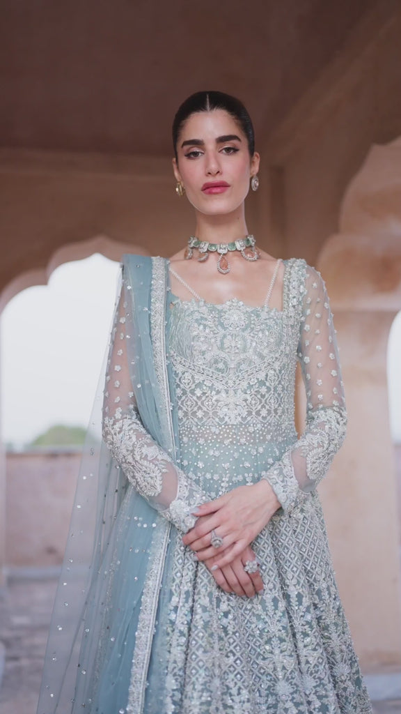 Capturing the true essence of heritage craftsmanship, Dorien is a vision of timeless beauty and refined artistry. Cut from a delicate mint blue net, the pishwas glimmers with resham, stone, and sequin embellishments that exude pure elegance.