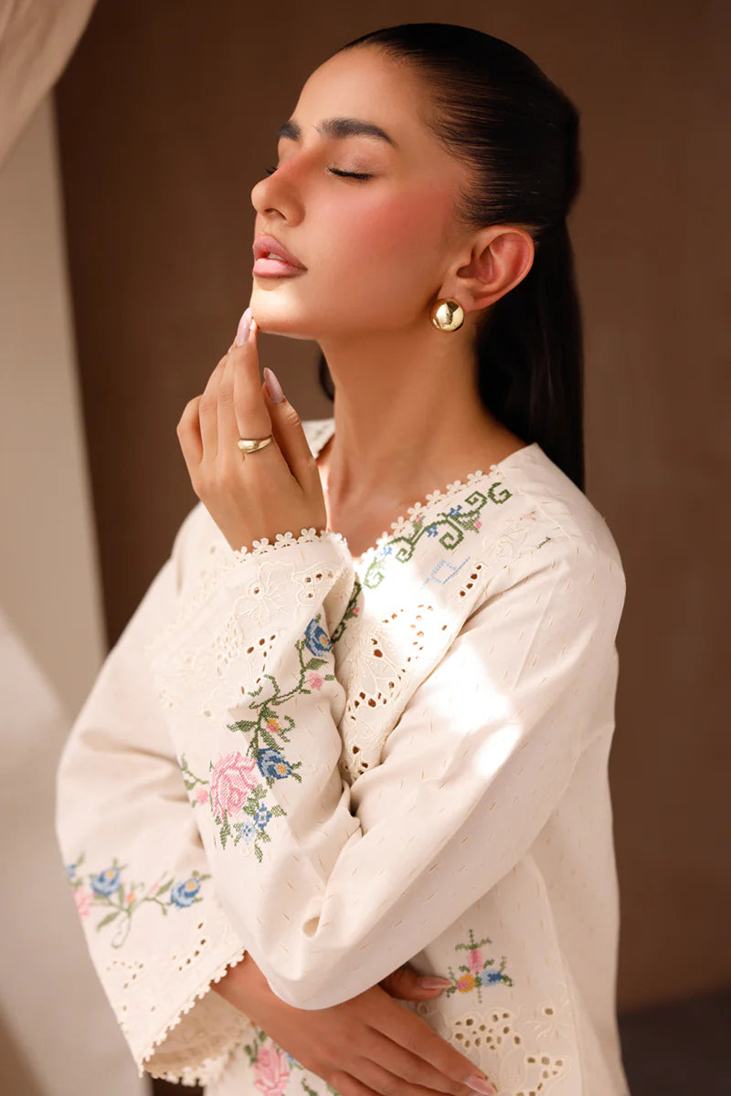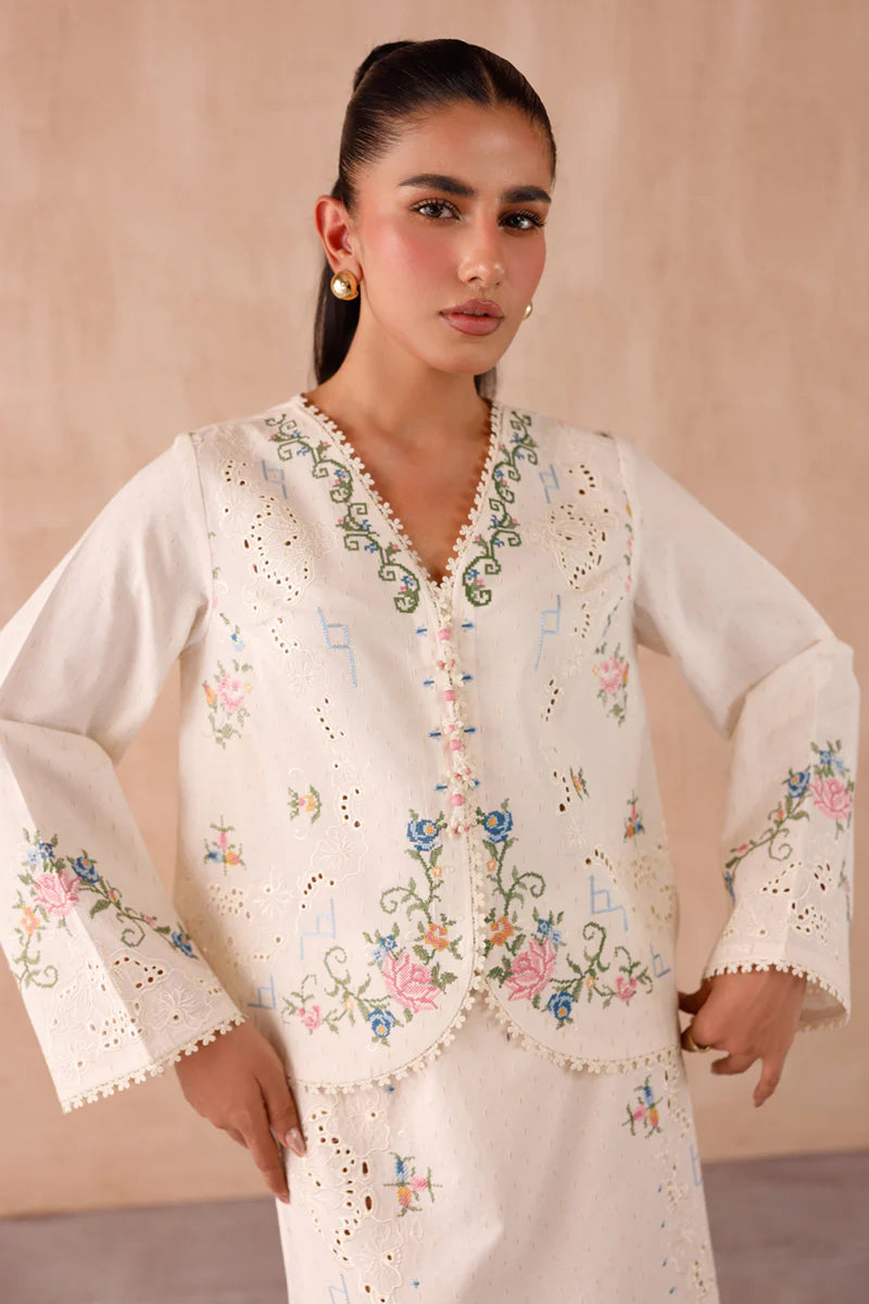 Our latest off-white ensemble, “ZENA,” is more than just a two-piece – it’s a statement in elegance. Crafted with refined artistry, this design is adorned with soft, multi-colored floral embroidery that whispers luxury and grace.