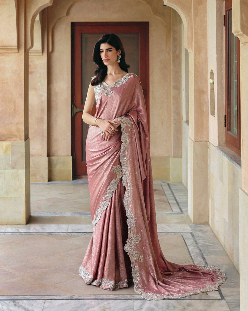 “Jahari” embodies timeless elegance and refined sophistication, showcasing Faiza Saqlain’s signature craftsmanship. Cut from luxurious dusty pink shimmer silk, the blouse is adorned with exquisite pearl and dabka embellishments that exude regal allure.