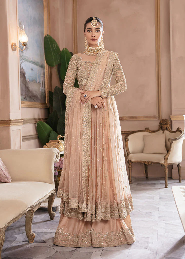 Mehroz is a modern silhouette flaunting away an airy net pishwas in an elegant shade of peach. The pishwas has a gorgeously hand embellished bodice, with an exaggerated flare of shiny ornaments, such as sequins, crystals, naqshi and dabka. The outfit is paired with Korean raw silk sharara pants and a net dupatta with mesmerizing spray of sequins. This outfit is bound to set formal luxe standards for the upcoming wedding season.