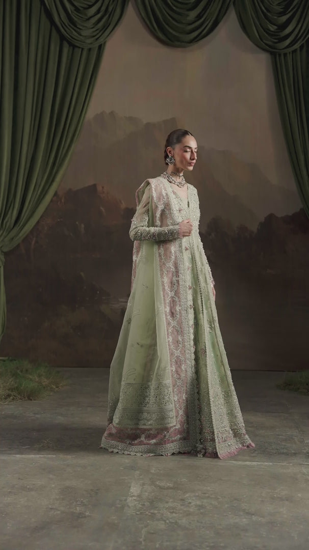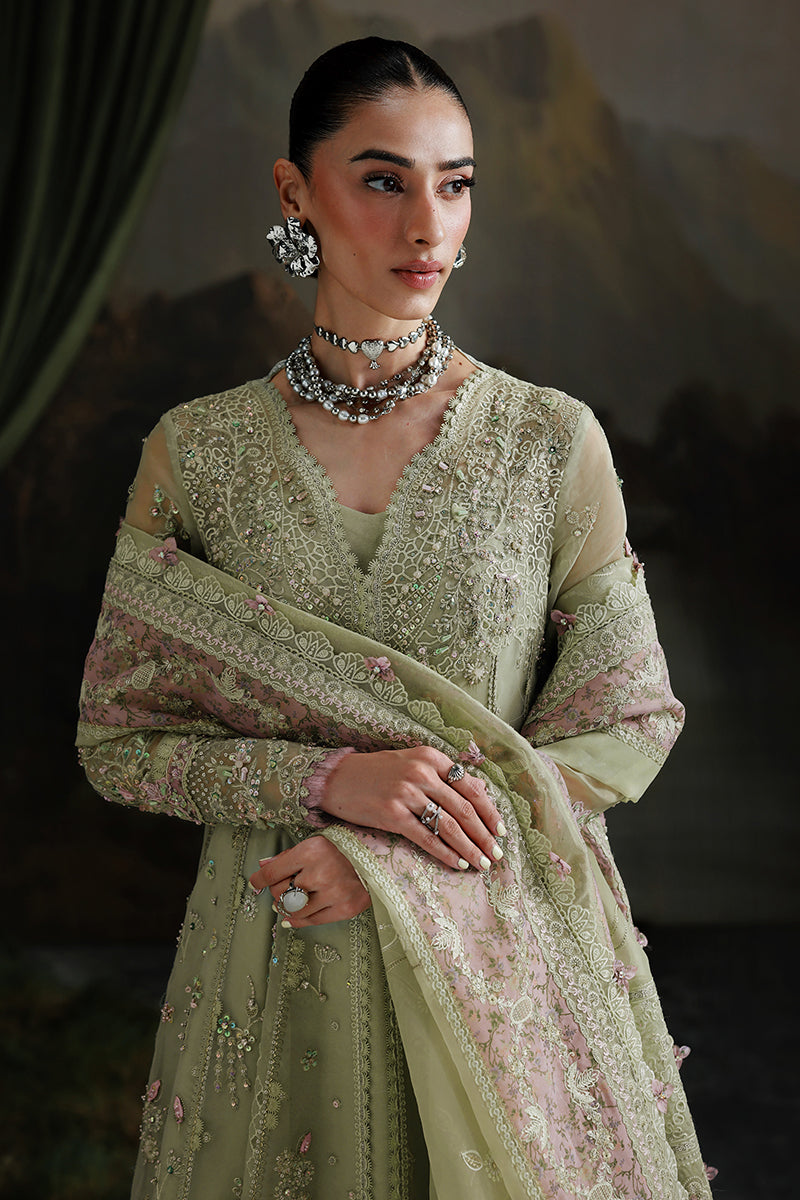 The organza dupatta completes the look with breathtaking embroidery — featuring digital printed borders, four-sided laces, and patti accents that lend an aura of grandeur. Paired with a dyed raw silk trouser, “SAGE AURA” is a perfect expression of festive opulence and understated grace.