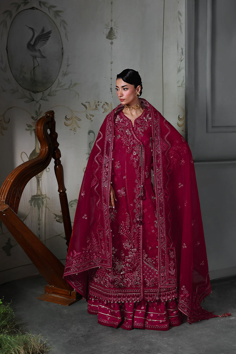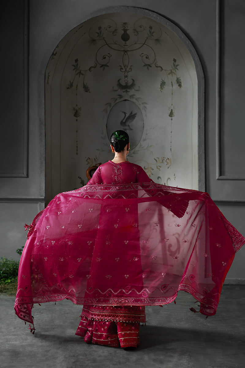 The sleeves, enhanced with handmade embroidery and lace, radiate femininity and sophistication. The organza dupatta, elevated with embroidered pallus, digital-printed fabric, and four-sided embroidered borders, adds a touch of regal charm — making it a true statement of grace. Completing the ensemble is a digitally printed silk sharara, perfectly balancing tradition and trend for an effortlessly elegant look.