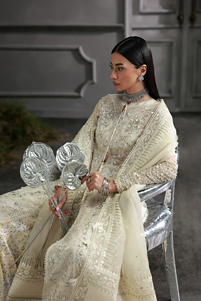 “IVARA” is an ode to refined sophistication and timeless elegance — a symphony of organza craftsmanship, delicate embroidery, and digital artistry. Designed by Qalamkar, this exquisite ensemble blends tradition with modern allure, making it an ideal choice for festive gatherings and wedding celebrations.
