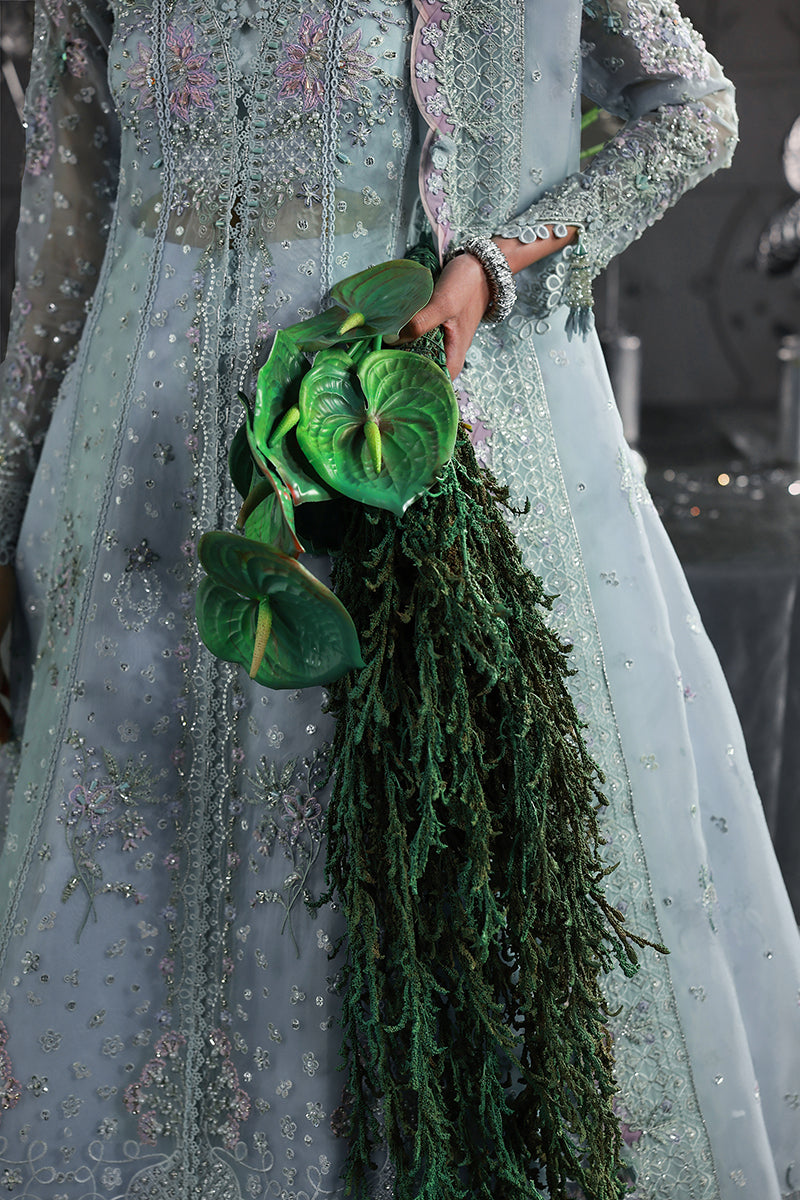 A sheer organza dupatta, exquisitely embroidered along all four sides, adds a soft, ethereal layer to the ensemble. Completing this regal look is a dyed raw silk lehenga that enhances movement and luxury, making “SERENE AQUA” an ideal choice for wedding festivities, receptions, and formal evening gatherings.