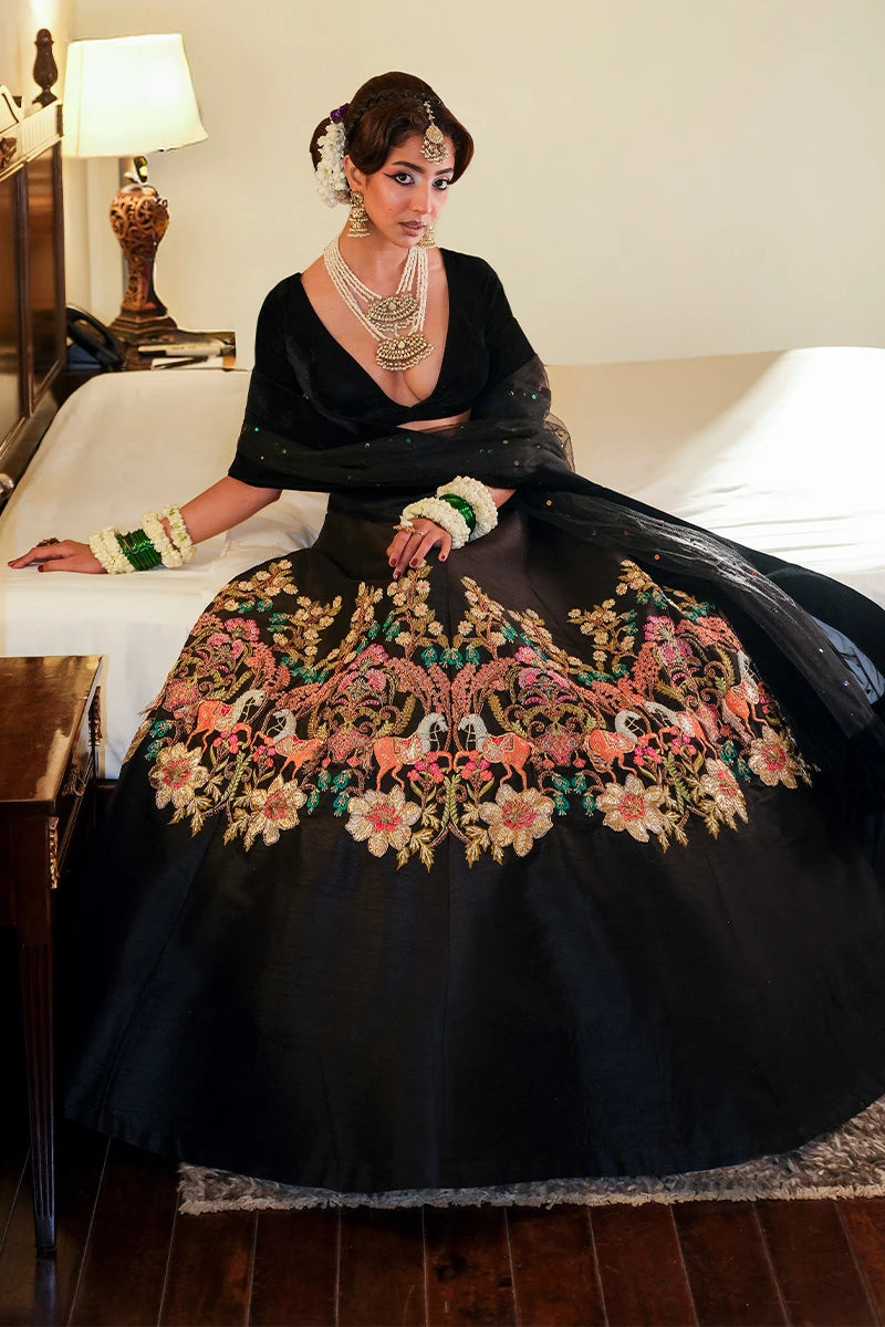 The ensemble features a velvet blouse with a deep neckline and short sleeves, exuding effortless allure and luxury. It is paired with a full-flared Indian raw silk lehenga, exquisitely crafted with multicolored embroidered panels that add vibrant artistry to the dramatic black base.