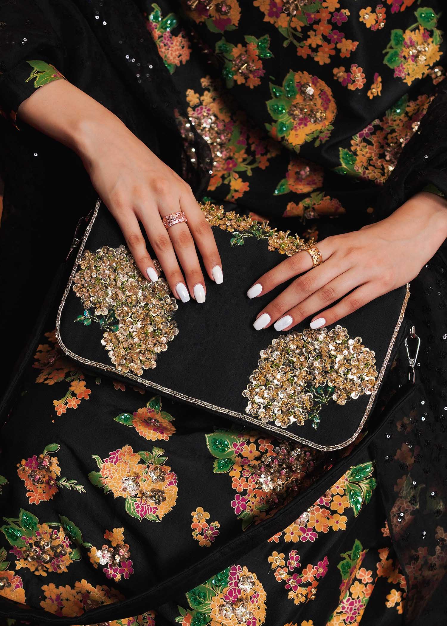 An exquisite raw silk block printed shirt and culottes embellished all over with dainty fine details of gold sequins and pink and gold buggle beads with halter neckline. It comes with black organza duppatta heavily sprayed with black sequins all over.