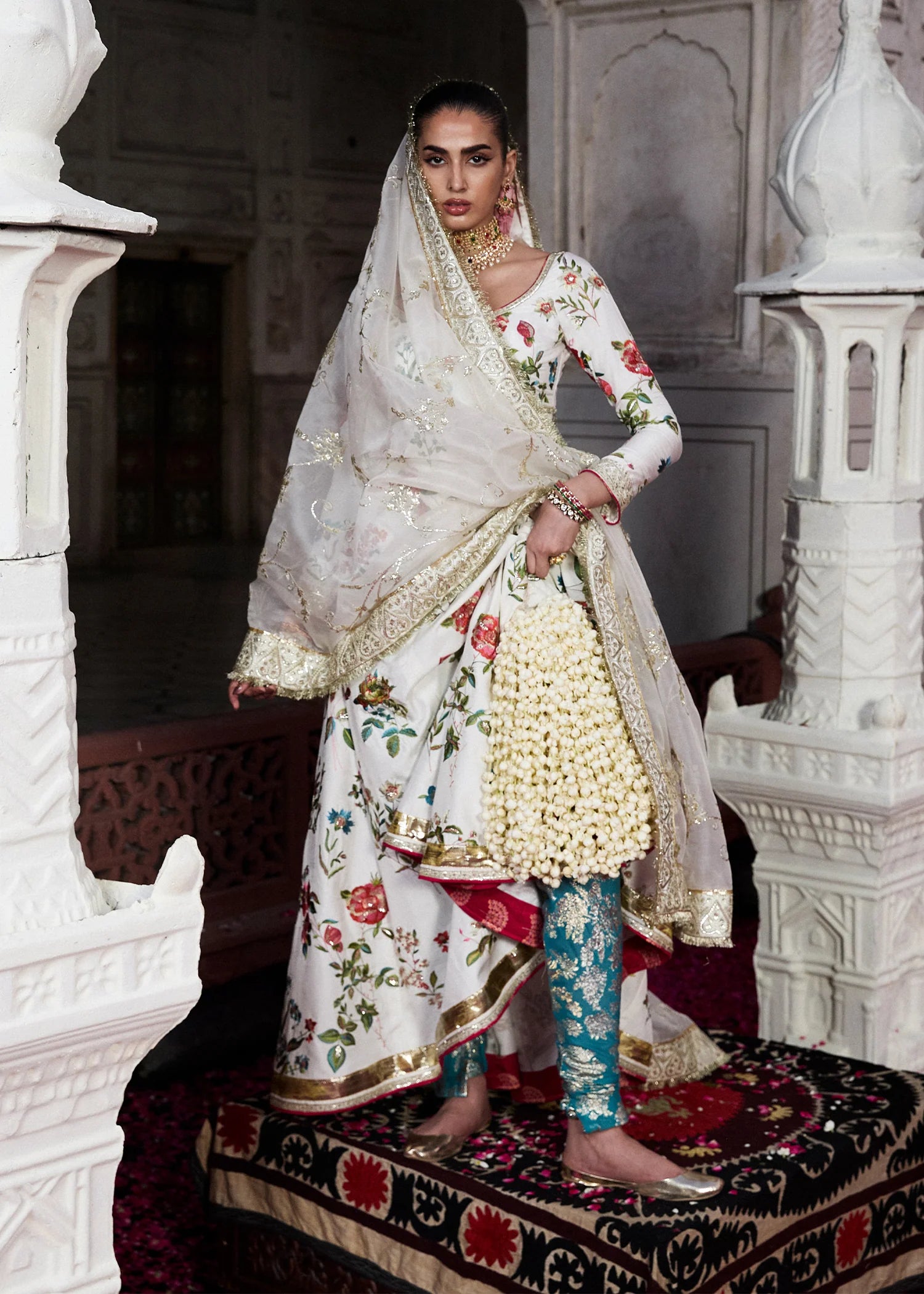 An Ivory Korean raw silk peshwaz, richly embroidered in Gara florals, ornate lappa and gotta detailing at the hem, and luminous silver sequin accents. Paired with a stunning organza dupatta, featuring bold Gara embroidery borders adorned with vibrant red rose motifs, and finished with delicate gotta trimmings. Complemented by a sleek Chanderi silk churidar, this ensemble exudes understated elegance.