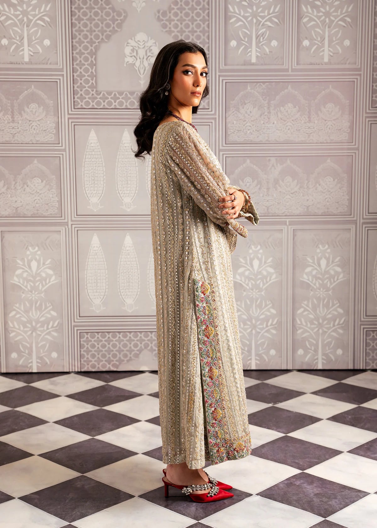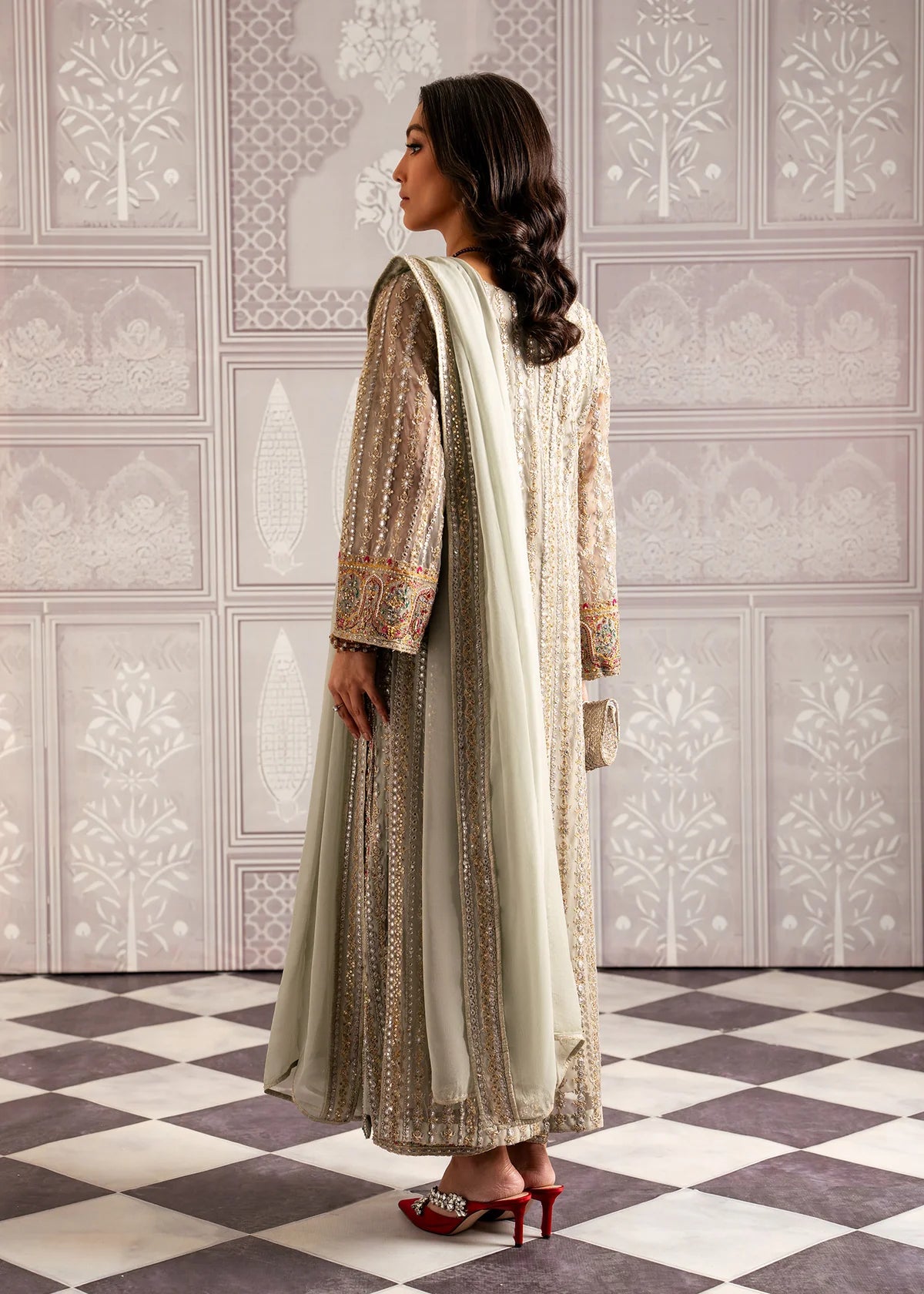 Step into ethereal elegance with Mint Gold from Echoes of Elara. This soft mint long shirt, crafted from delicate net, is adorned with signature Mahgul embellishments, creating a symphony of intricate handwork that shimmers with timeless allure. Paired with regal jamawar trousers and a flowing net dupatta, this ensemble embodies grace and sophistication