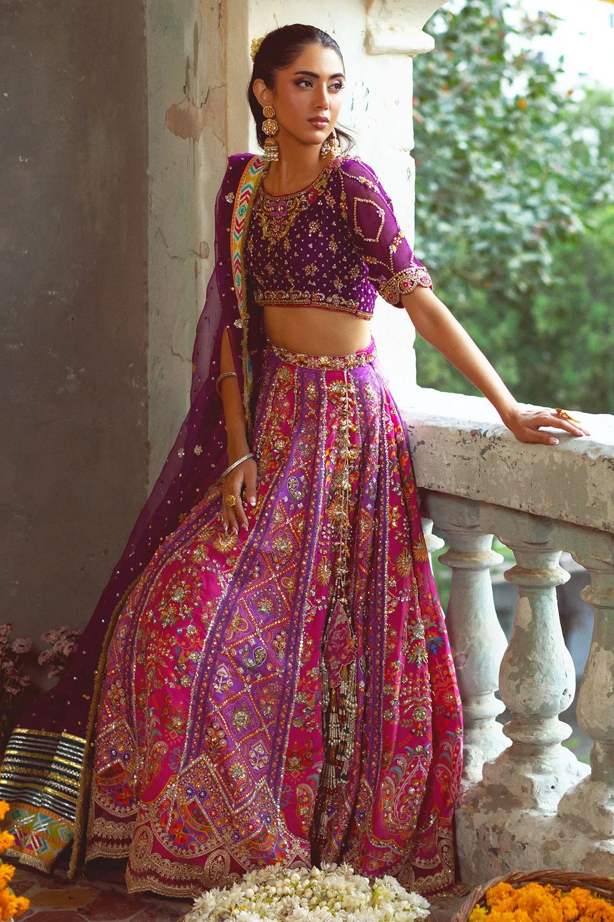 The back features delicate cutwork and handcrafted tassels, adding a touch of romance to the ensemble. Paired with a pure raw silk digital print lehnga, adorned with silver and gold zardozi embroidery and a zari appliqué border, Miraat blends heritage with modern sophistication. The look is completed with a color-blocked organza dupatta, beautifully decorated with sequins, vintage gota, and fringe detailing, making it an unforgettable choice for wedding festivities and formal celebrations.