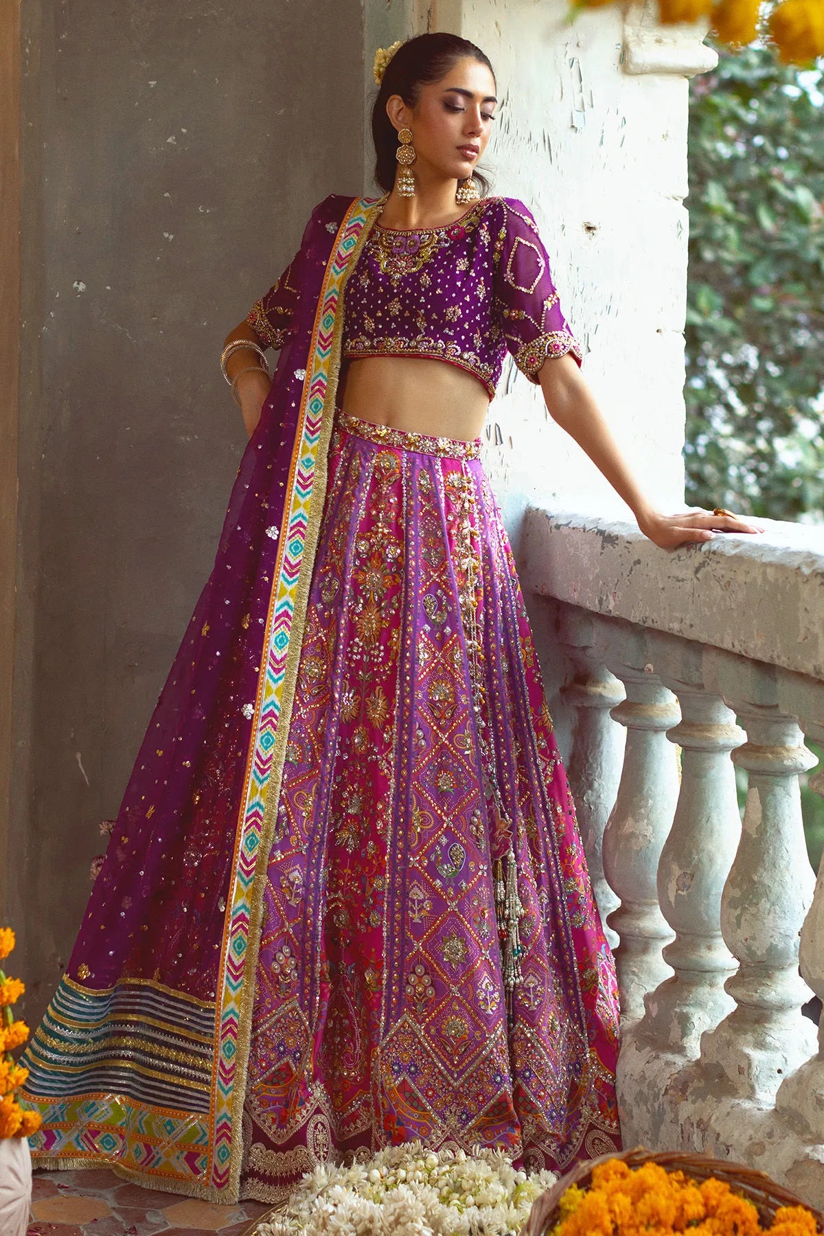 A masterpiece of timeless grandeur, Miraat by Annus Abrar is a celebration of regal craftsmanship and artistic finesse. This exquisite deep aubergine cotton silk choli is adorned with classic zardozi and resham rosette detailing, exuding an old-school charm that feels both nostalgic and refined. The center front sparkles with shimmering sequins and intricate dabka work, creating a captivating focal point that radiates elegance.