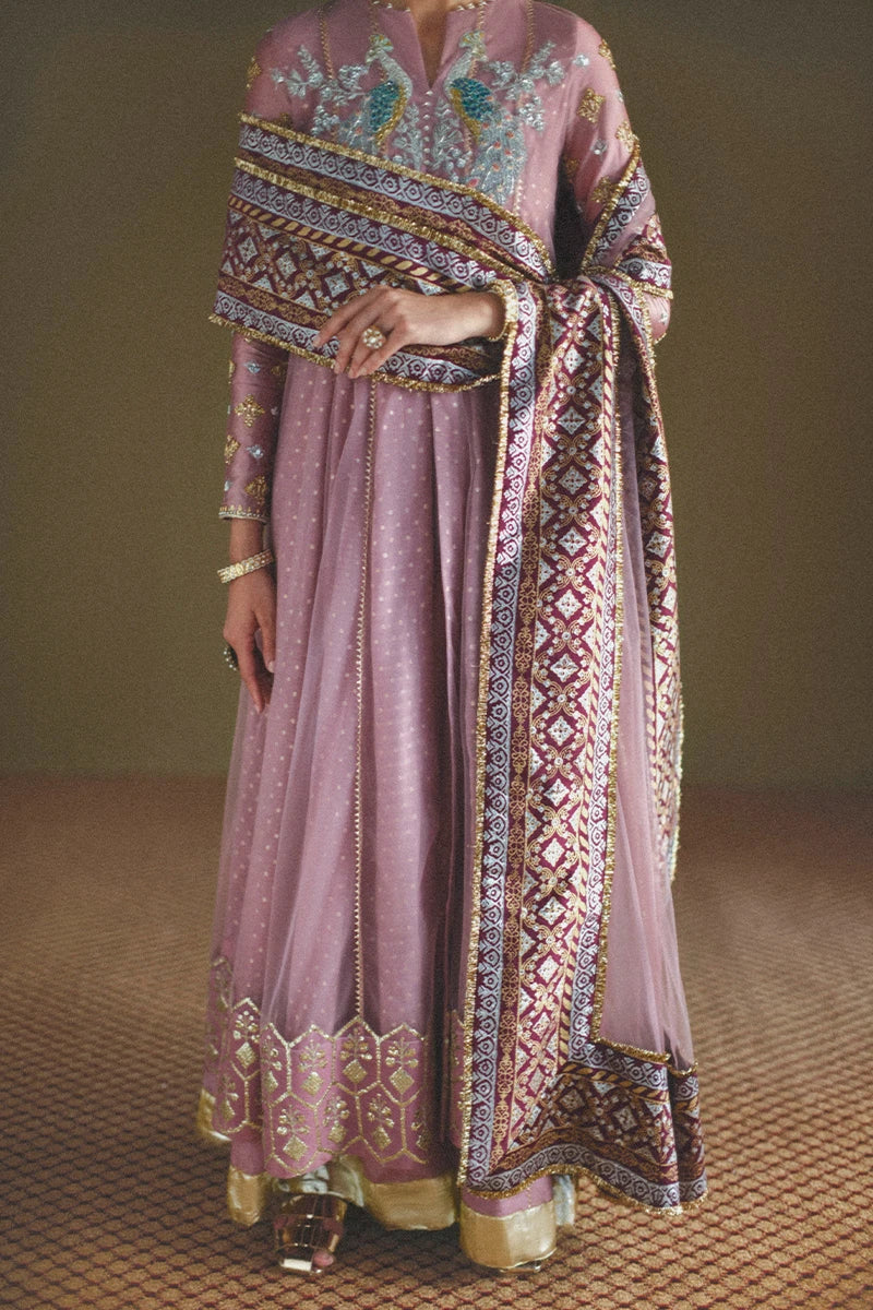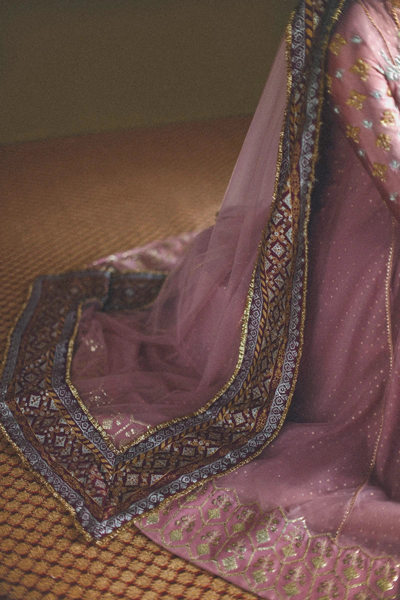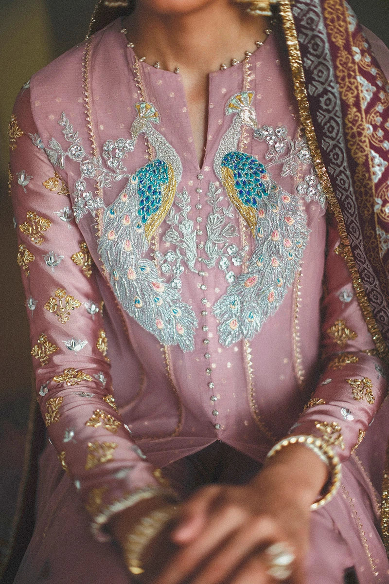 Embrace regal heritage with Morni by Zeb and Zeeshan, exclusively available at Ranza Wear UK — a mesmerizing creation that beautifully intertwines tradition and timeless grace. Draped in a serene tea pink hue, this exquisite ensemble radiates festive sophistication through its intricate craftsmanship and fluid silhouette.