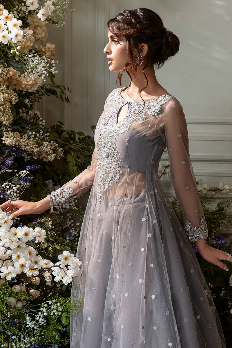 A stunning kalidar featuring a intricately hand-embellished neckline that enriches the net fabric, adorned with delicate silver embroidered boti chaan throughout and powder pink embroidery along the hemline. The elegance extends to the embroidered fitted sleeves. It's paired with a powder pink mukaish net dupatta with stunning ruffled edges, perfectly matched with a captivating layered handkerchief skirt in the same exquisite color.