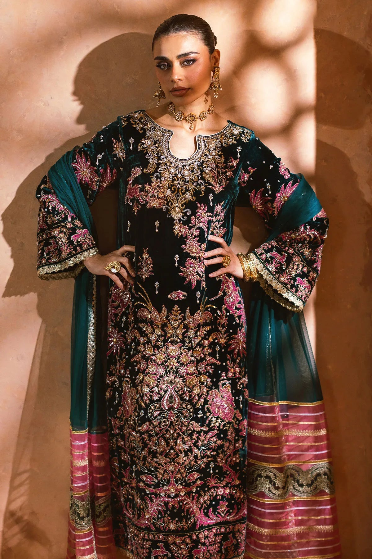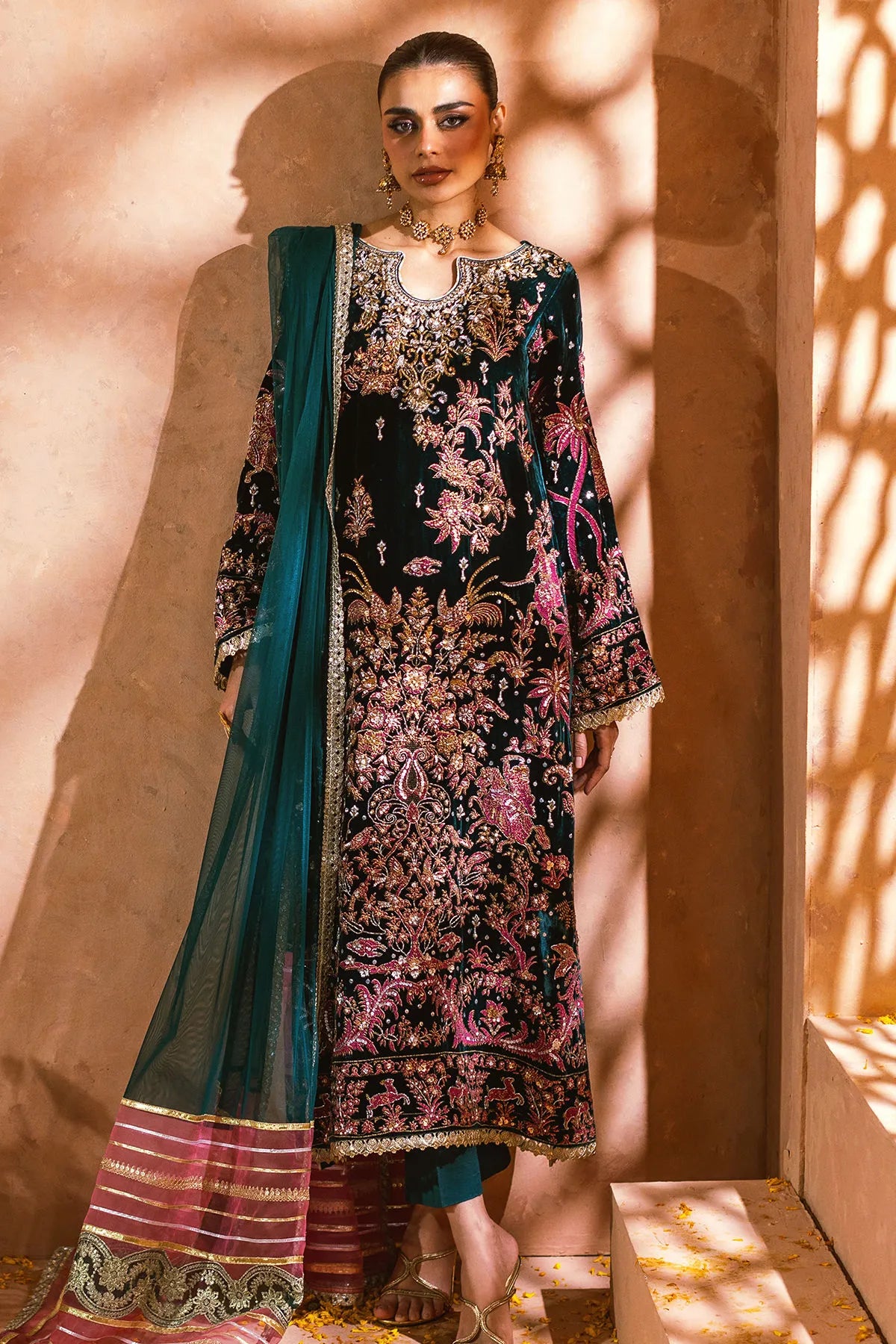 A stunning ode to festive grandeur, Nerali by Annus Abrar radiates elegance through its refined craftsmanship and vibrant palette. Tailored from luxurious two-tone velvet in a mesmerizing emerald green hue, this long silhouette shirt features screen-printed motifs in striking pink, beautifully enhanced with light-reflecting sequins and zardozi embroidery in gold, silver, and antique tones. Each detail captures the perfect harmony of color and texture, evoking timeless sophistication.