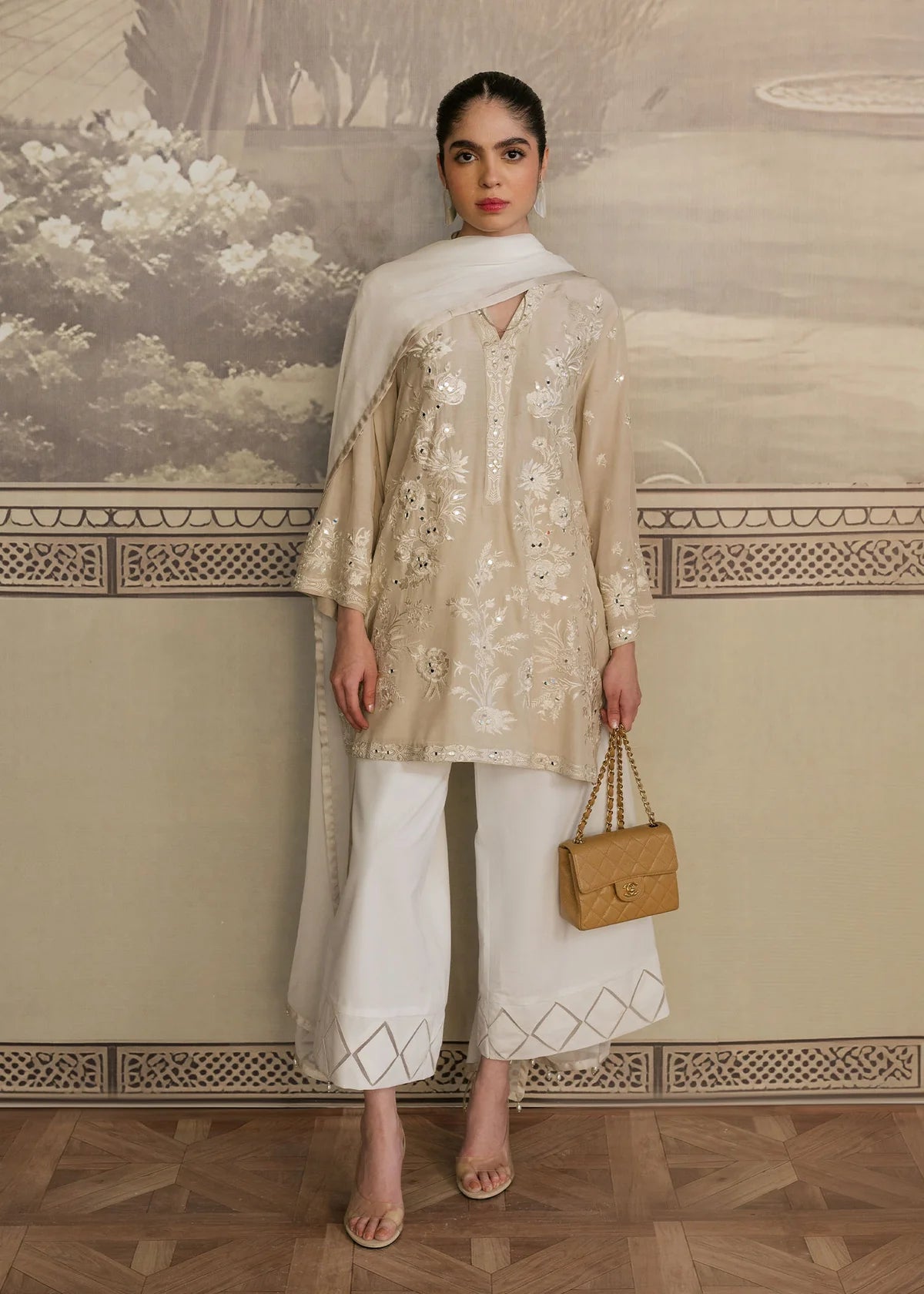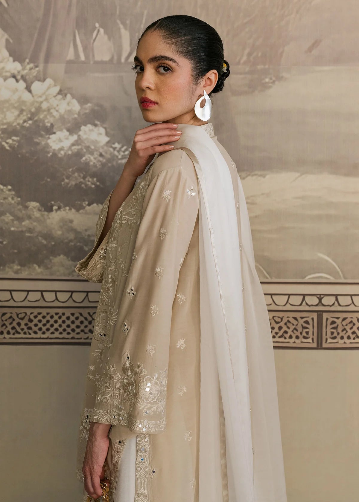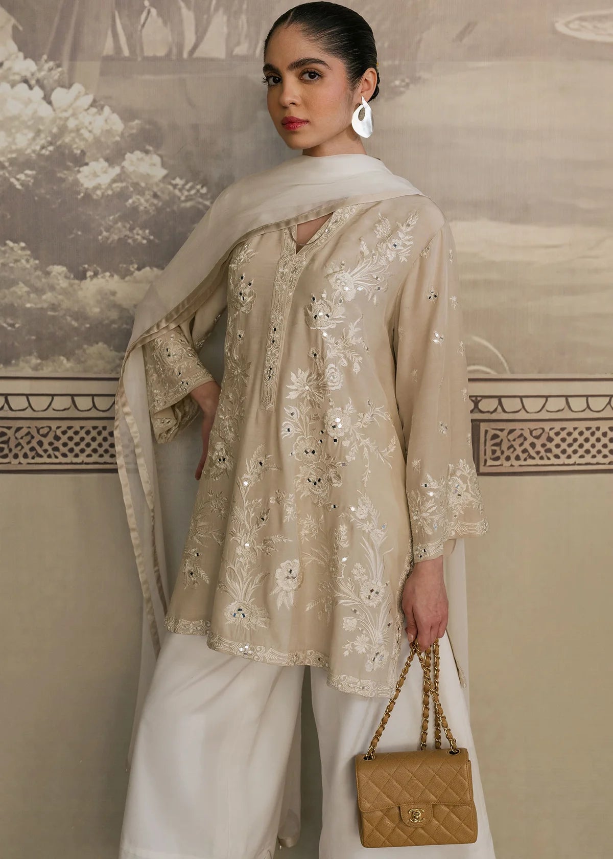 Nia from Samara by Mahgul is an elegant beige ensemble featuring a luxurious grip silk shirt, tailored raw silk trousers, and a soft, flowing chiffon dupatta. Meticulously curated, this refined look is perfect for making a sophisticated statement this spring.