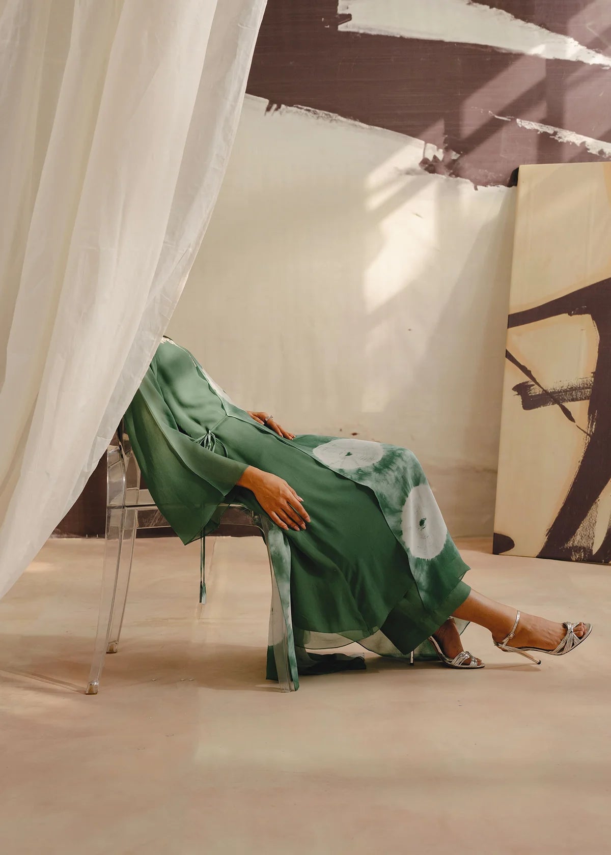 Exude effortless elegance with Olive Sun, a green long shirt designed in breezy chiffon. The flowing silhouette pairs beautifully with tailored raw silk trousers, creating a harmonious blend of comfort and sophistication. Perfect for daytime gatherings or evening events, this ensemble is a versatile addition to your wardrobe.