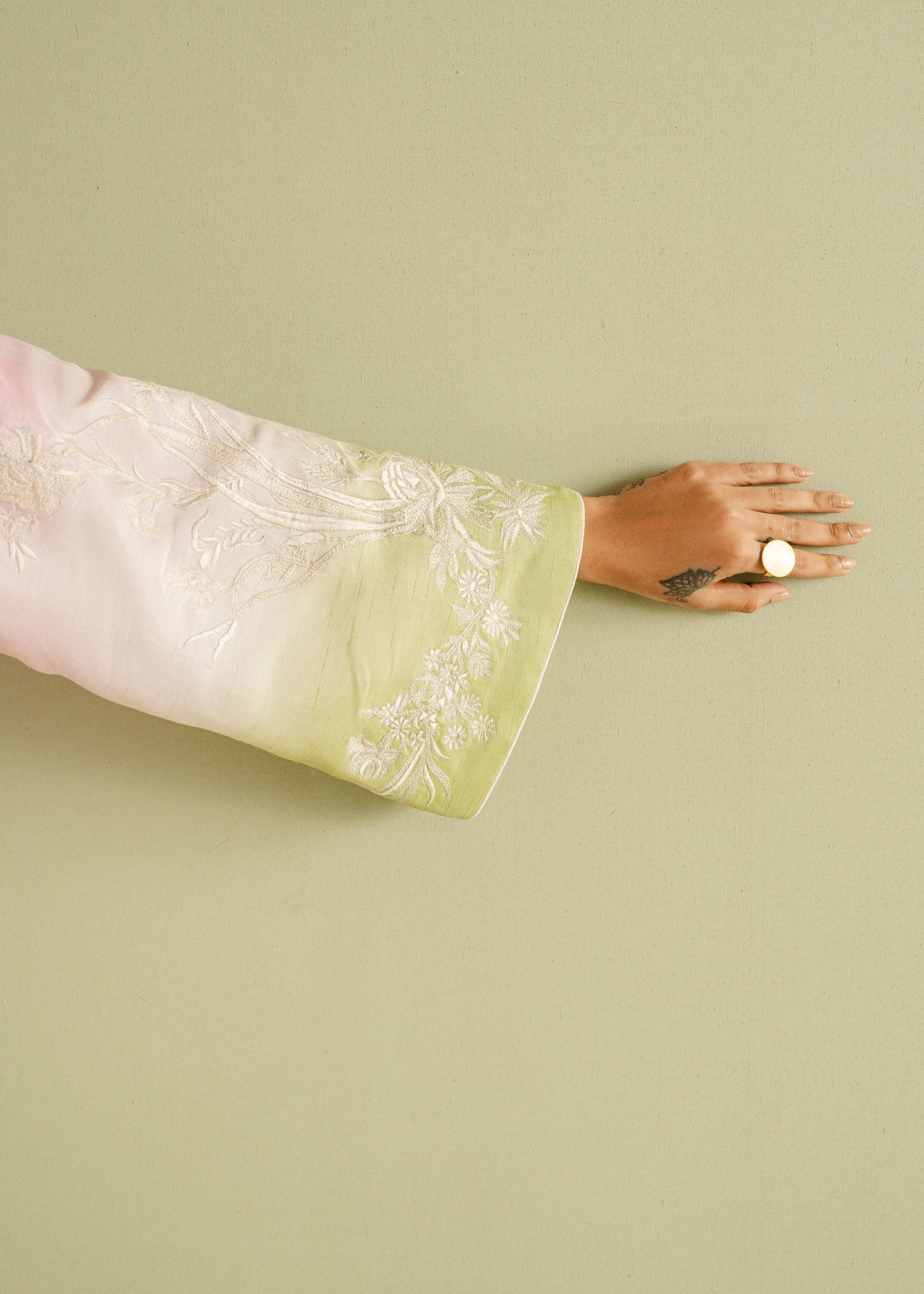 Ombré Flower from Ayana’s Garden — a romantic blend of pink and green, blooming in fluid ombré harmony. The Korean raw silk shirt and trouser ensemble captures a painterly elegance, with soft transitions of colour and a silhouette that flows with grace. Perfect for moments that call for charm, colour, and quiet sophistication.