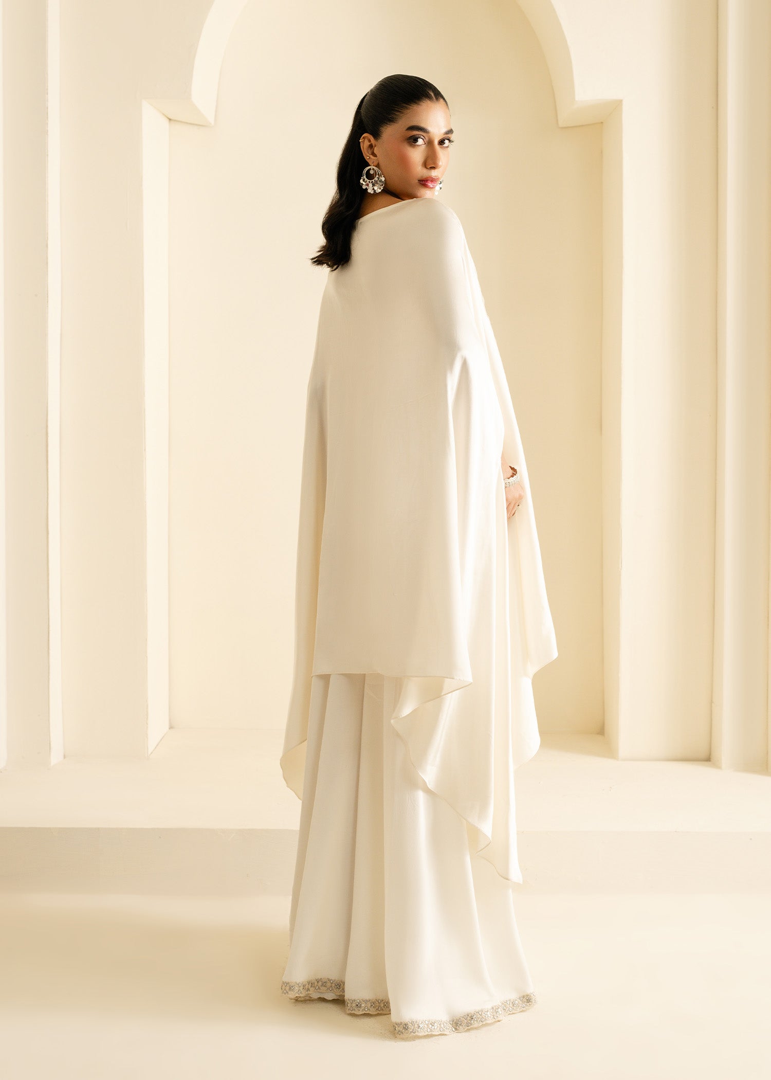 Pearl Reverie from Nooreh — a dreamlike expression of elegance in soft ivory. Crafted in lustrous satin, the kurti pairs beautifully with a fluid sharara, creating a silhouette that’s both graceful and contemporary. A statement in refined minimalism and quiet luxury.