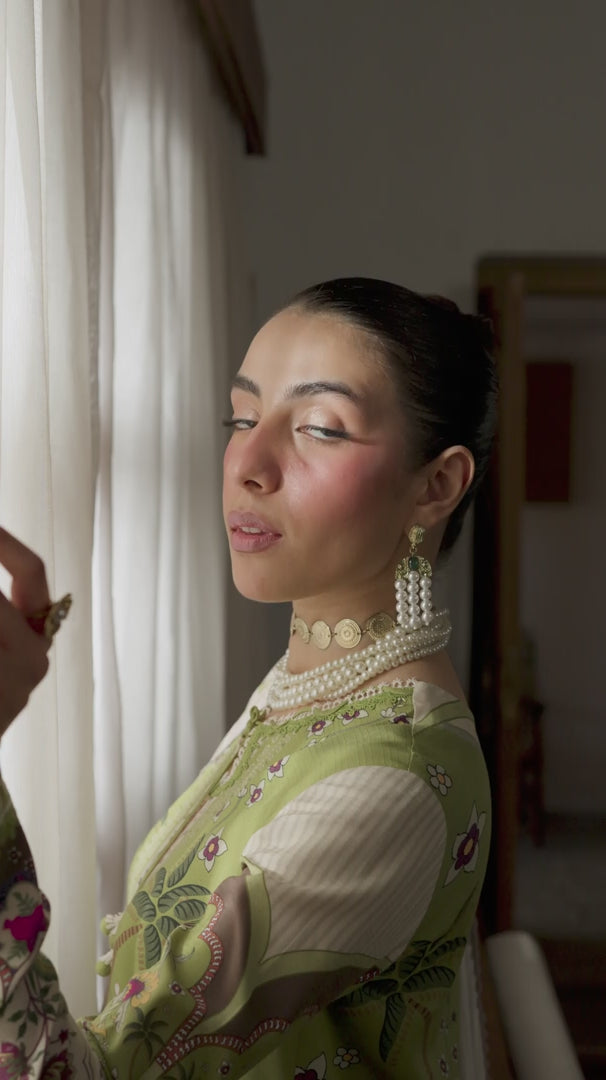 The jacquard weaved shirt showcases digitally printed front, back, and sleeves, beautifully uplifted with a chikankari embroidered front border that brings timeless artisanal charm. The sleeves feature embroidered lace, adding soft finesse and a delicate finishing touch to the overall silhouette. The jacquard texture enhances the outfit with richness and a premium drape.