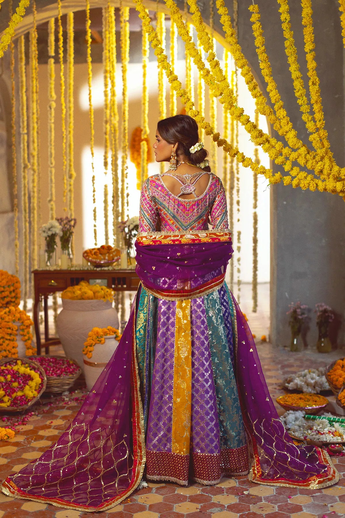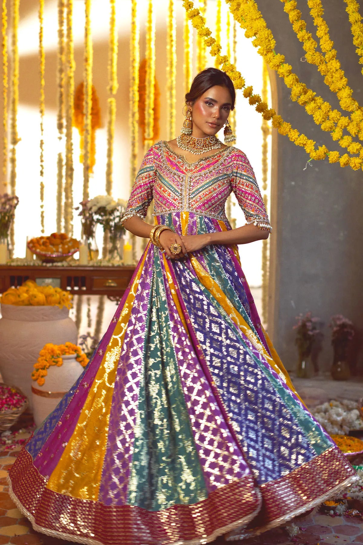 A true celebration of colour and craftsmanship, Rameera by Annus Abrar embodies artistic luxury and timeless grace. This multicoloured kalidar pishwas, crafted from pure raw silk, showcases a digitally printed bodice accentuated with intricate zardozi embellishments that shimmer with every movement. The centre back features exquisite cutwork detailing, creating a delicate interplay of texture and design.