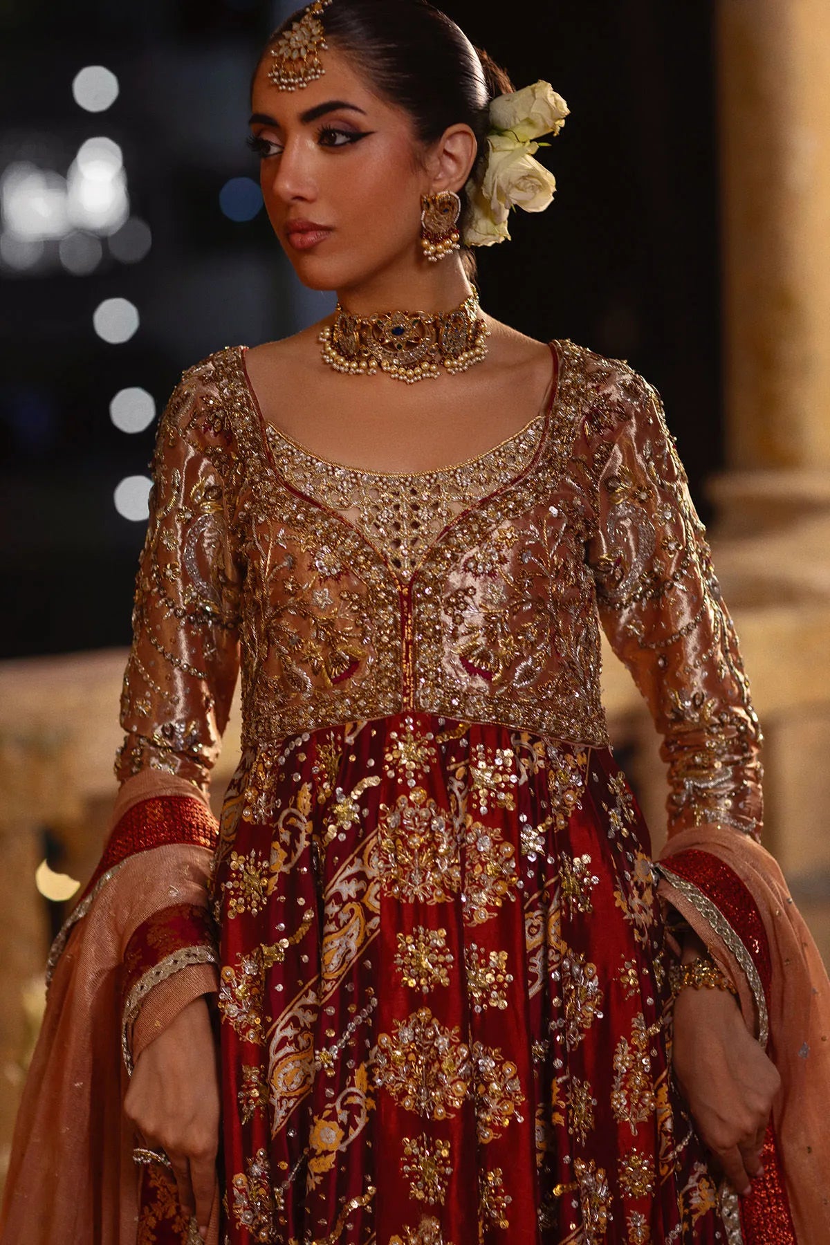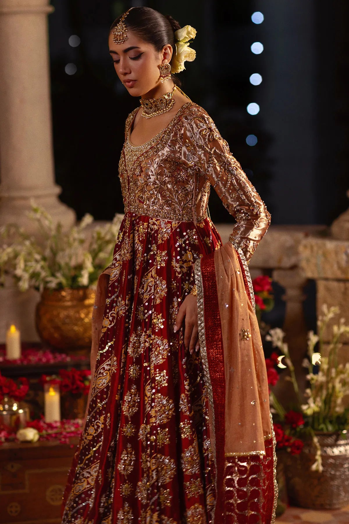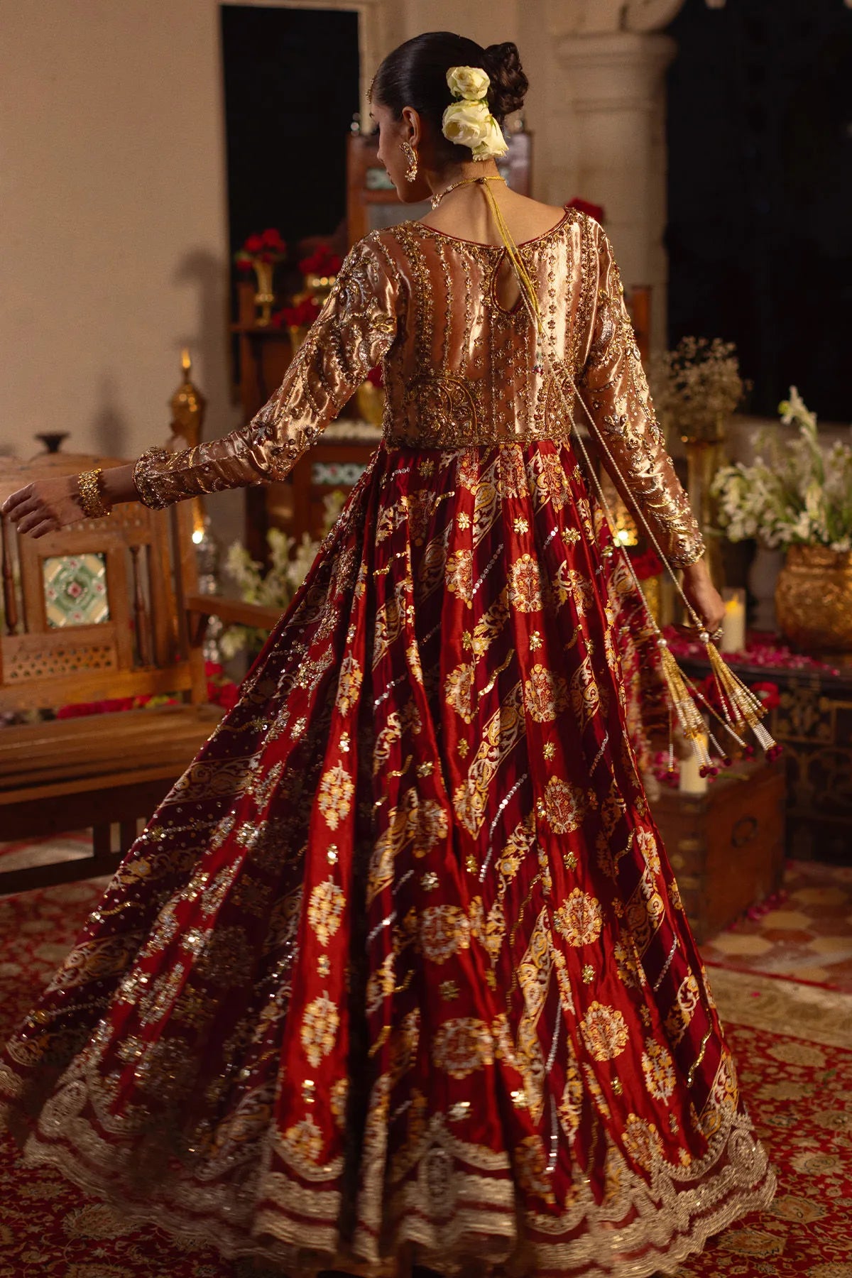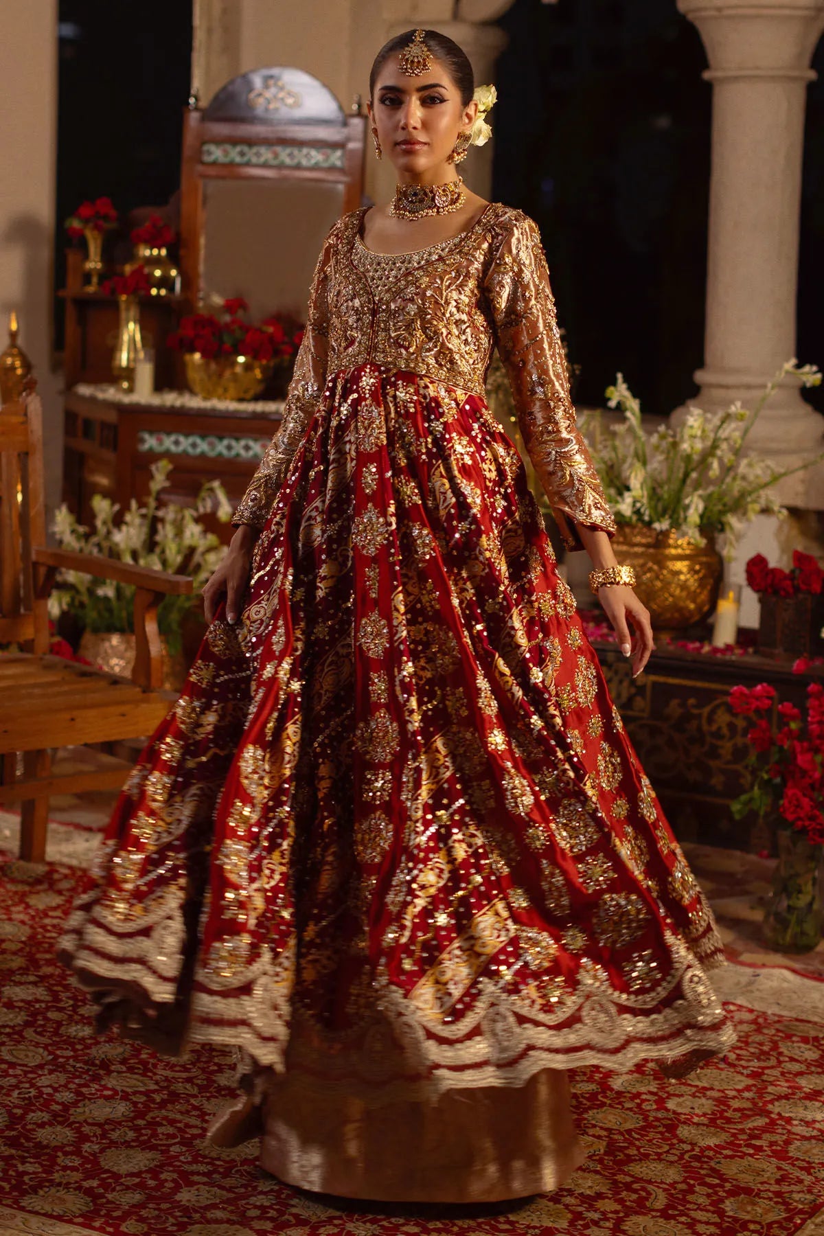Regal and timeless, Rano Kalidar by Annus Abrar exudes the grandeur of traditional craftsmanship infused with contemporary grace. This floor-length pishwas, rendered in enchanting shades of maroon, red, and deep crimson, is tailored from luxurious silk that radiates richness and depth. The center front and back feature exquisite hand block-printed details, lending a heritage-inspired charm to the ensemble. The bodice is adorned with intricate zardozi embellishments in gold, silver, and antique tones — a true reflection of artisanal finesse and elegance.