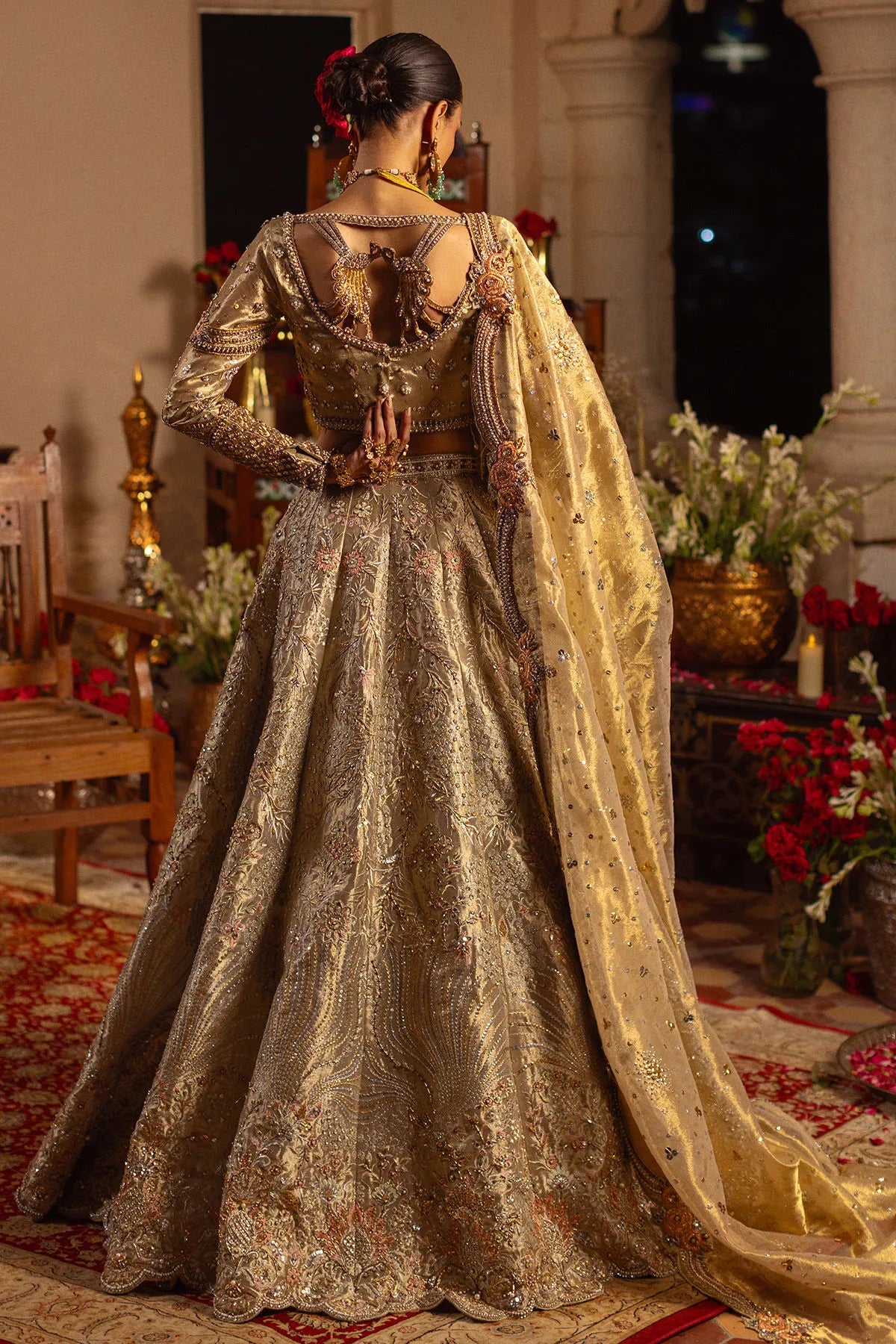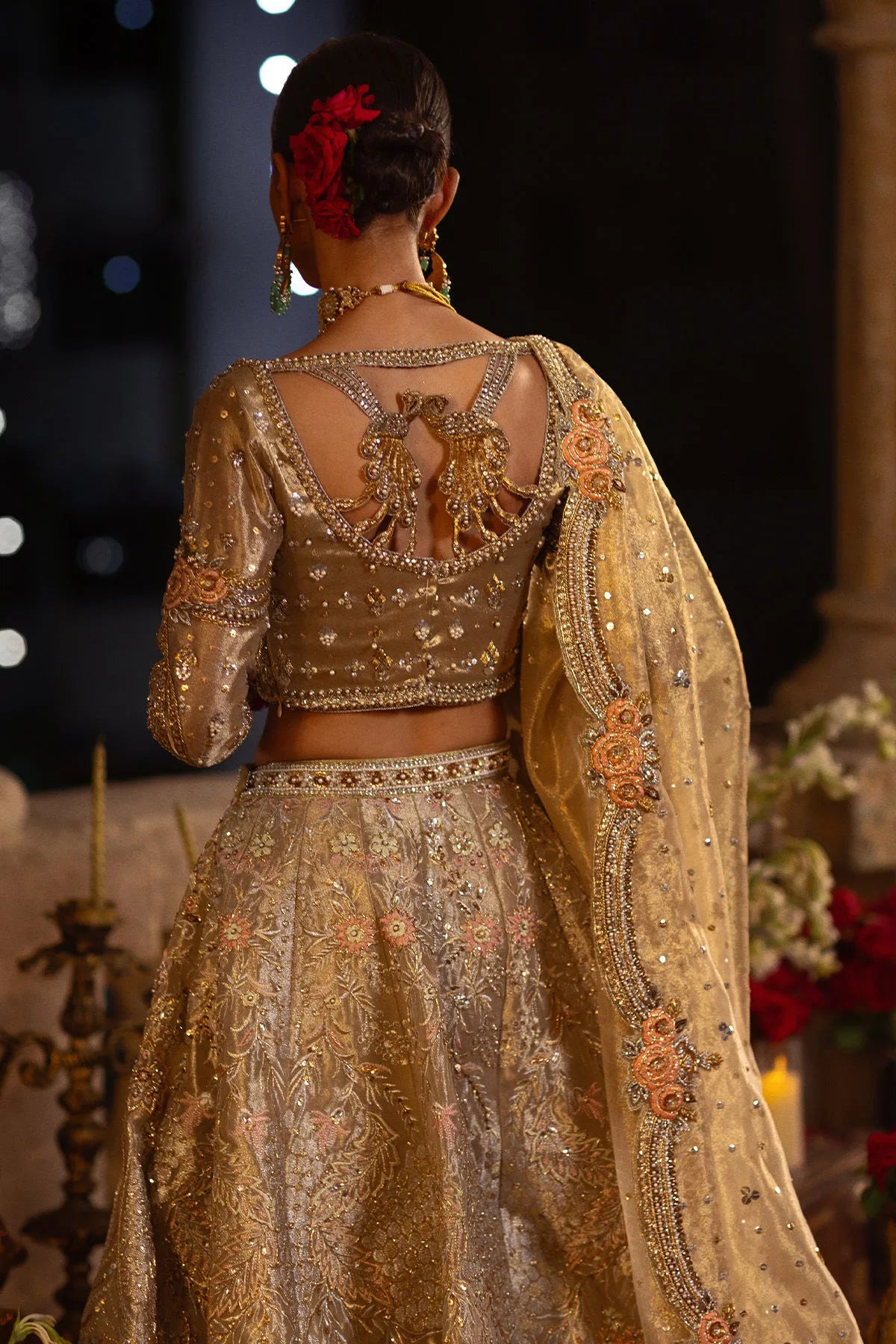 The look is elevated with a flared lehnga, featuring hand-embroidered accents in gold, peach, and pink, enriched with zardozi and sequin work that glisten beautifully under the light. The center front is adorned with handcrafted tassels, adding fluidity and charm to the ensemble. Completing the look is a long dupatta, exquisitely bordered with silk thread rosettes and zardozi detailing, creating a perfect harmony of tradition and sophistication. Ideal for wedding festivities, receptions, and formal occasions, Reeja exudes timeless grandeur.