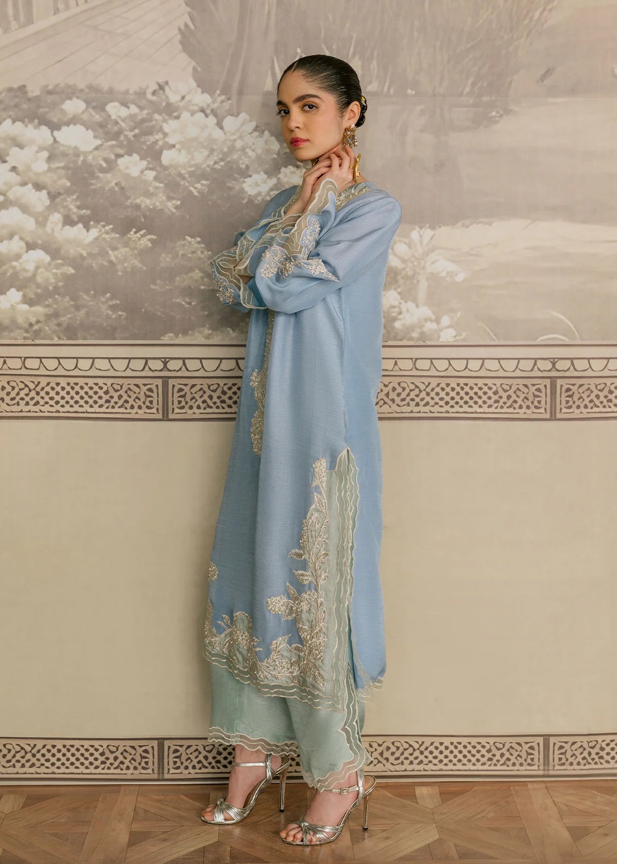Reha from Samara by Mahgul is a stunning two-piece ensemble featuring a soft blue and mint green two-toned Korean raw silk long shirt paired with mint green raw silk pants. This feminine creation exudes elegance and luxury, creating a refined, mesmerizing look perfect for any occasion.