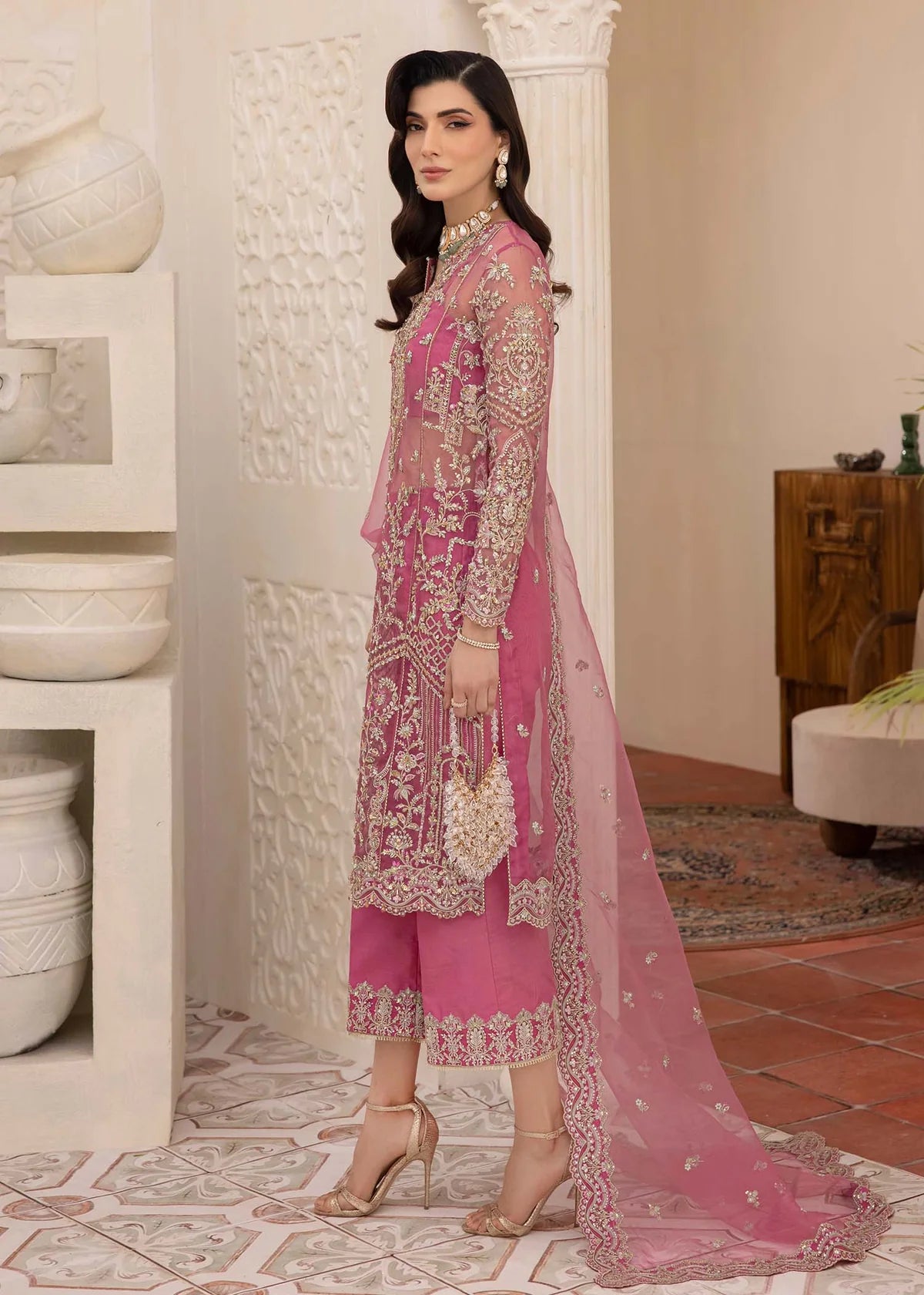 This stunning ensemble in mauve organza is a masterclass in luxury, adorned with intricate, nature-inspired floral embroidery that flows seamlessly across the fabric. Every motif is meticulously crafted, creating an opulent texture that is both refined and captivating. The gown is further elevated with a dazzling array of sequins, pearls, and crystals, their strategic placement adding a touch of luminous sophistication that catches the light with every movement. Paired with an embroidered net dupatta, its subtle borders enhance the gown's exquisite detailing, offering a perfect balance of elegance. Completing the look are wide-leg culottes, their fluid, tailored silhouette introducing a modern, fashion-forward element that effortlessly complements the ornate top. This ensemble is a breathtaking fusion of intricate craftsmanship and high-end embellishments, designed for those seeking unparalleled elegance and contemporary luxury.