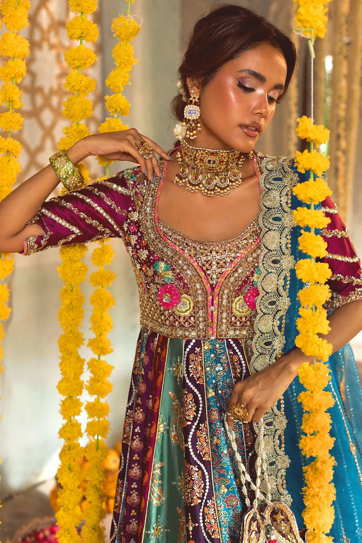 Vibrant and artistic, Roneela Kalidar by Annus Abrar celebrates the beauty of color and craftsmanship in perfect harmony. This multicoloured pishwas, crafted from pure raw silk, showcases a digitally printed bodice that comes alive with exquisite zardozi embellishments — a fusion of modern technique and timeless artistry. The front and back display a kaleidoscope of hues, offering a captivating visual appeal, while the centre back features intricate cutwork detailing that adds sophistication and depth to the design.