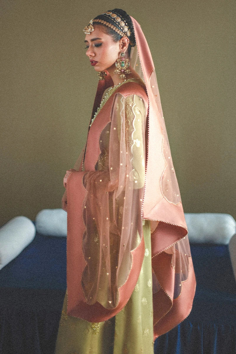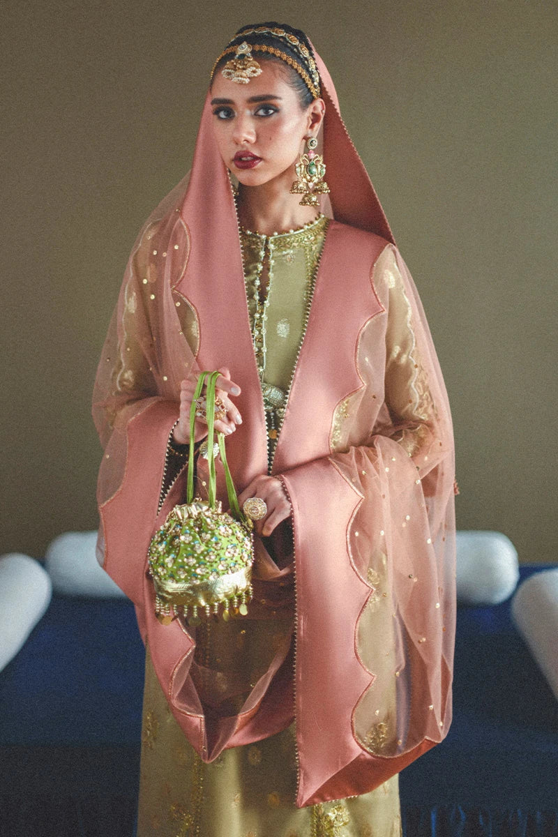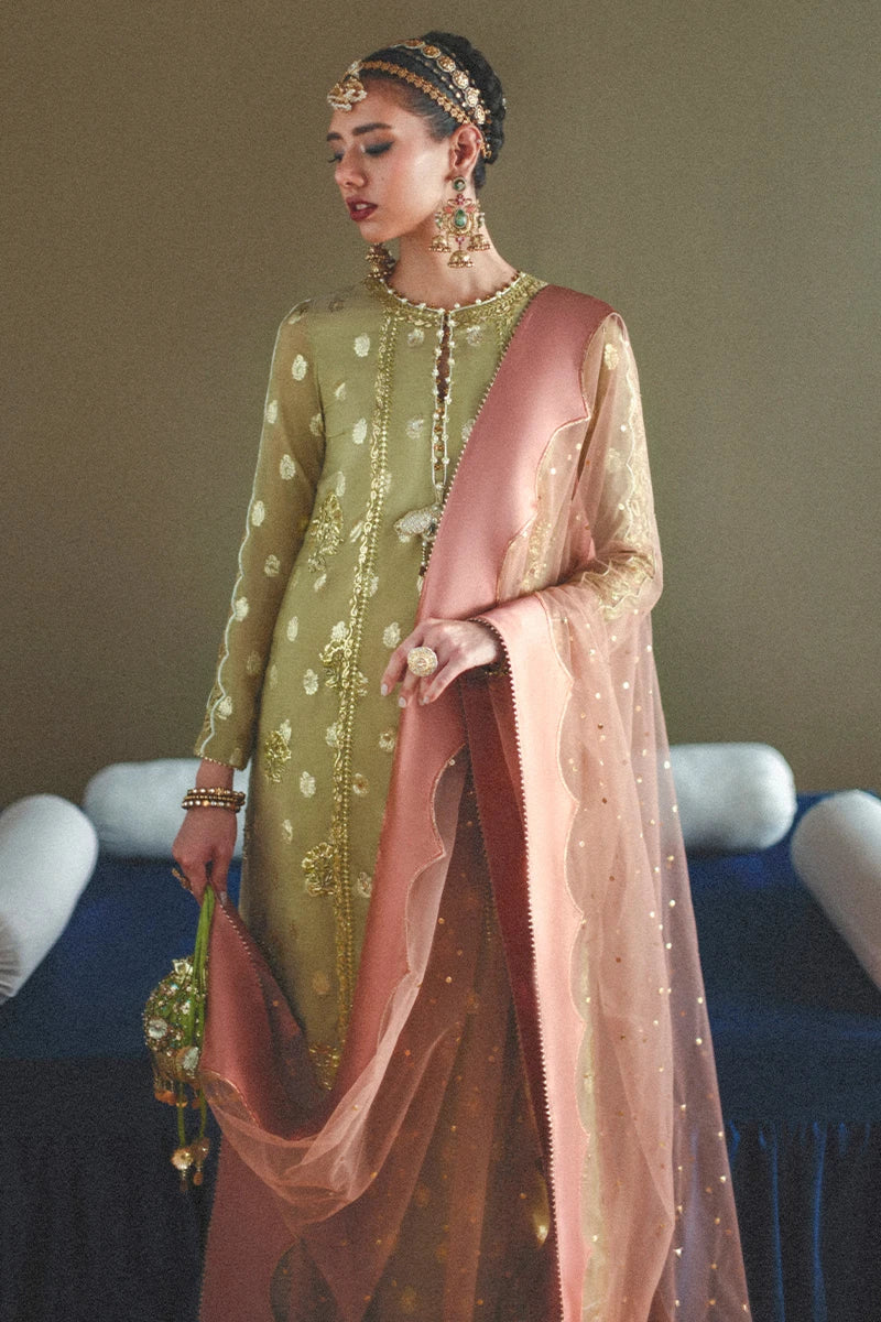A vision of refined grace and understated opulence, Rumi by Zeb and Zeeshan, exclusively available at Ranza Wear UK, embodies the essence of intricate craftsmanship and timeless charm. Draped in a soothing dull sage green hue, this exquisite ensemble strikes the perfect balance between traditional artistry and modern sophistication.