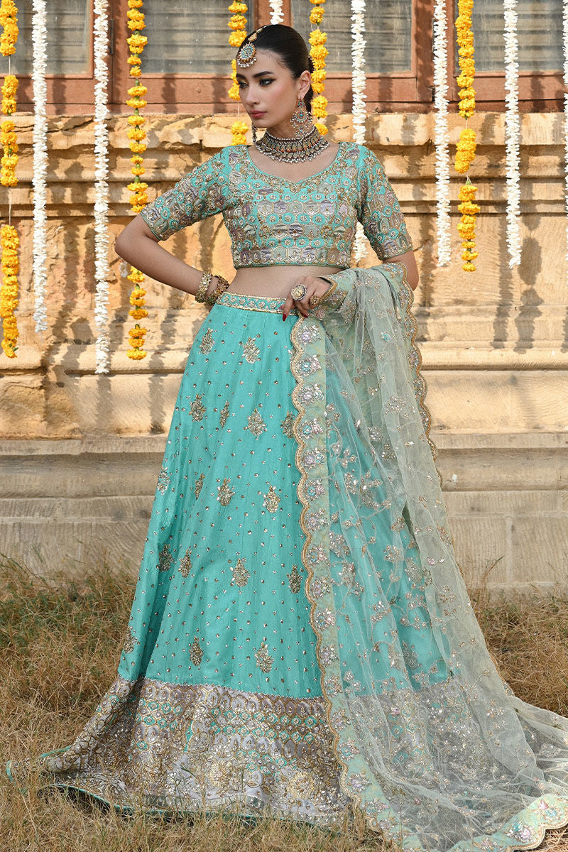 Traditions celebrated in colour with our timeless beauty aqua pure rawsilk lehenga choli. The choli, adorned with intricate applique in lilac, light green, and orange, features luxurious dabka, moti, sequins, gota, and gold zari embroidery, enhanced with purple and aqua resham and naqashi work. The V-neckline and half sleeves add a sophisticated touch. The lehenga, designed with floral motifs and a matching applique border in lilac and aqua, showcases refined embellishments, harmonizing perfectly with the choli. Complemented by a net dupatta featuring scalloped edges and jhal work, this outfit embodies timeless beauty and grace.