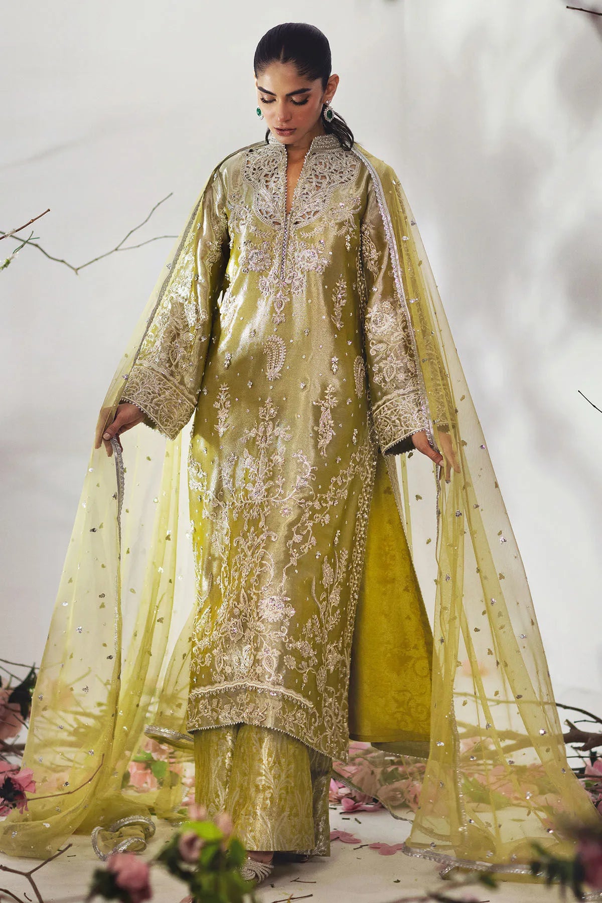 Radiant and refined, Samrin by Annus Abrar captures timeless sophistication with a refreshing modern touch. Crafted from shimmering lamé in an enchanting kiwi green hue, this elongated A-line silhouette exudes effortless grace. The shirt is adorned with delicate ivory silk thread embroidery, elevated by intricate silver zardozi accents that lend a touch of opulent artistry.