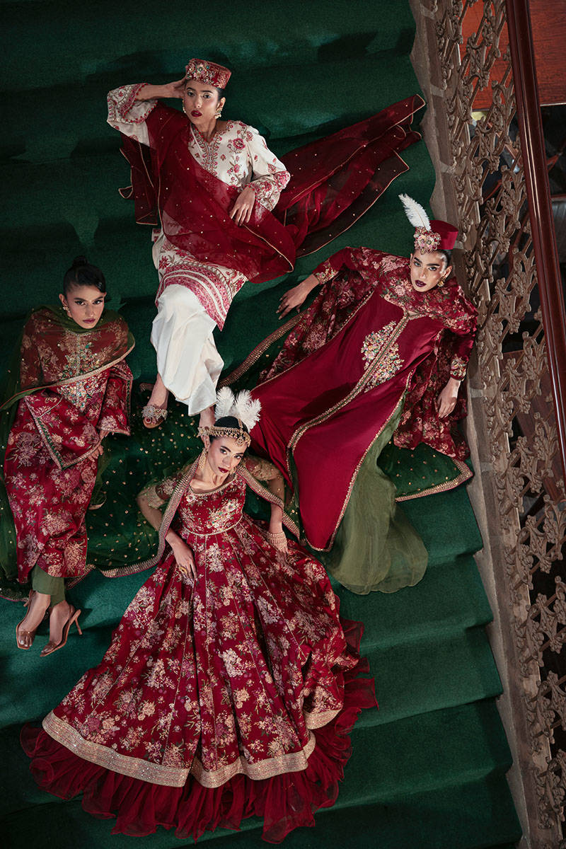 "Scarlet Rose" is an exquisitely tailored deep red pure raw silk long paneled shirt, adorned with intricate hand embellishments that make it a show-stopping piece. The shirt features a stunning blend of colored sequins, zardozi, and crystals, creating a timeless and luxurious design. Fitted sleeves are embellished with delicate motifs near the cuffs, adding a touch of detail to the sophisticated silhouette. Paired with a beautiful printed organza dupatta and leaf green flared trousers, crafted with layers of raw silk and organza, this ensemble strikes the perfect balance of modern elegance and timeless charm