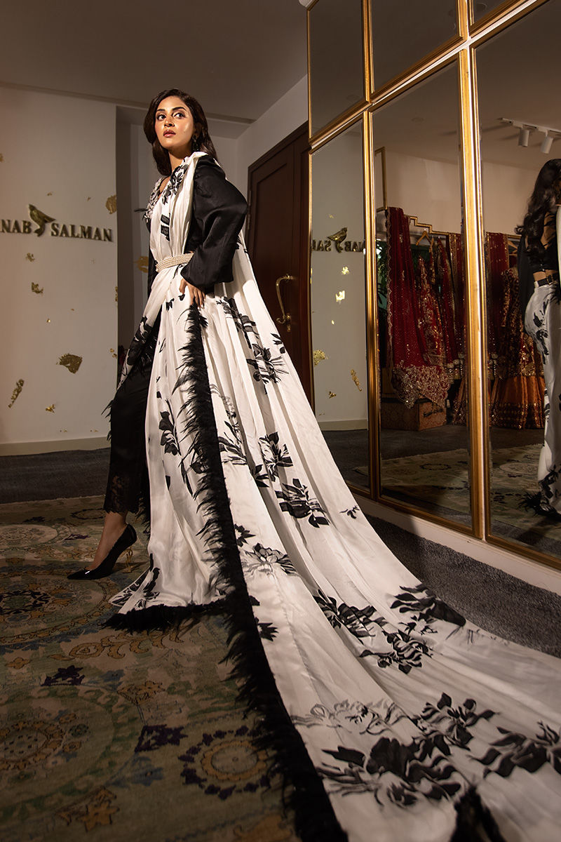 A gorgeous monochrome printed pant saree paired with a pearl belt. The lace detailing on the pants and hand embellished motifs on the blouse add to the overall look of the outfit.