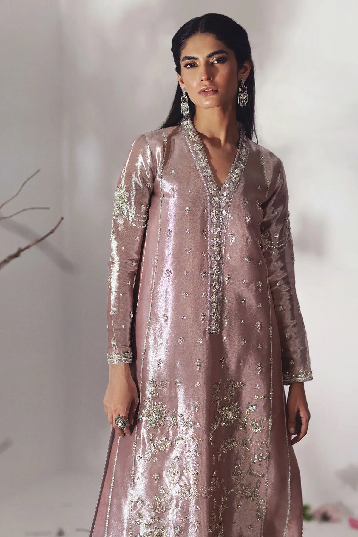 Radiating refined elegance, Soraya by Annus Abrar is a stunning creation in luminous rose gold lamé. The straight silhouette shirt captivates with its exquisite zardozi embellishments at the center front, artfully arranged to enhance the luxurious sheen of the fabric. The overlapping neckline, adorned with intricate handcrafted detailing, adds a touch of regal sophistication to this timeless design.