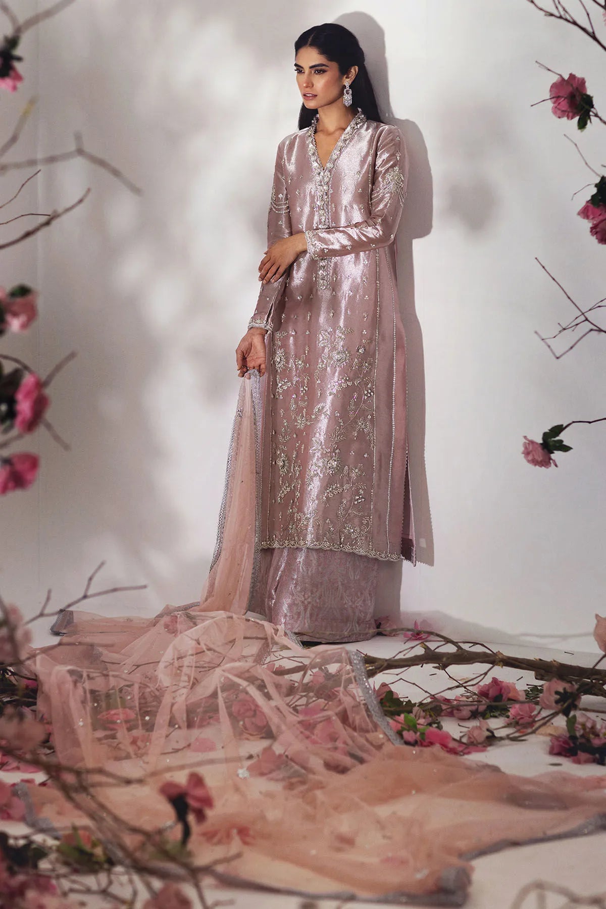 Paired with wide-legged flared pants in fine damask, the ensemble achieves a perfect balance of structure and fluidity. Completing the look is a delicate net dupatta, beautifully finished with sequins and lace, casting a soft shimmer with every movement. Soraya is a celebration of understated luxury — ideal for festive gatherings, elegant soirées, or intimate celebrations where grace speaks louder than grandeur.