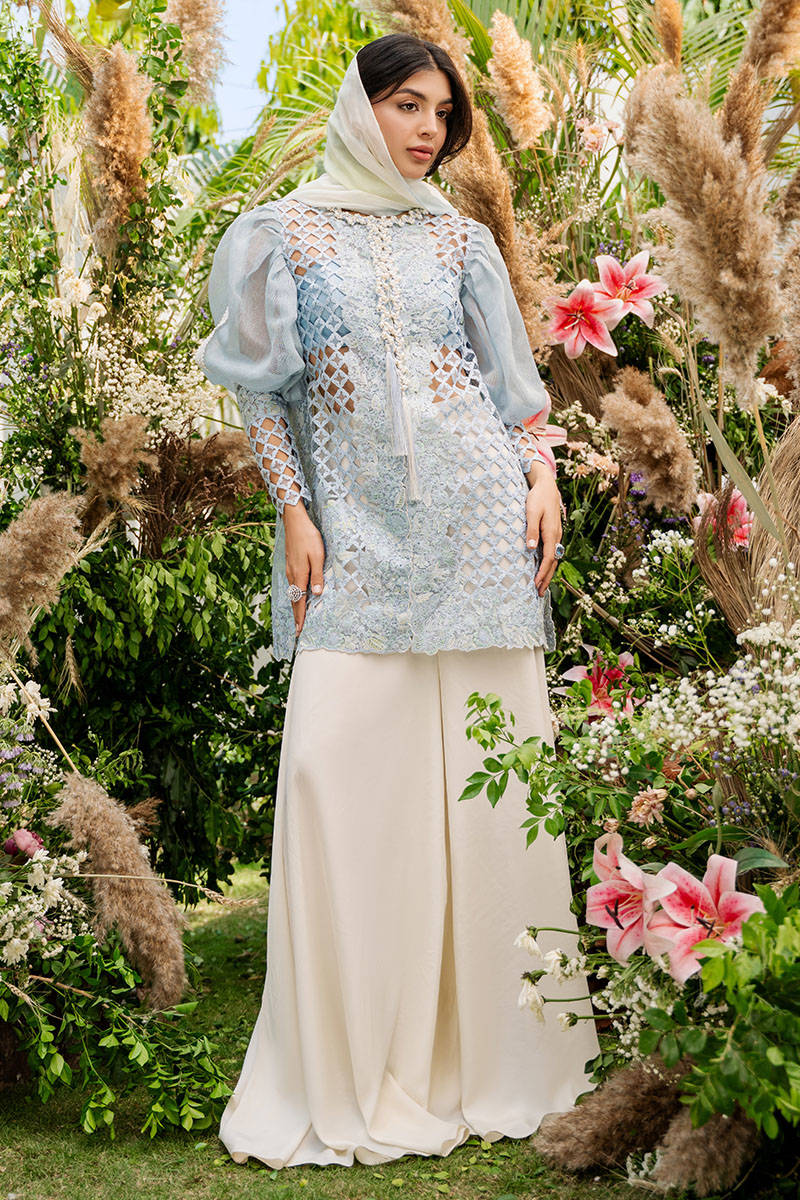 Sugar Dream is an ethereal jacket featuring delicate embroidery adorned with cutwork and shimmering sequins. The fusion-style puffed sleeves add a touch of drama, while the matching tube top and off-white bambi pants elevate the overall look with effortless elegance.