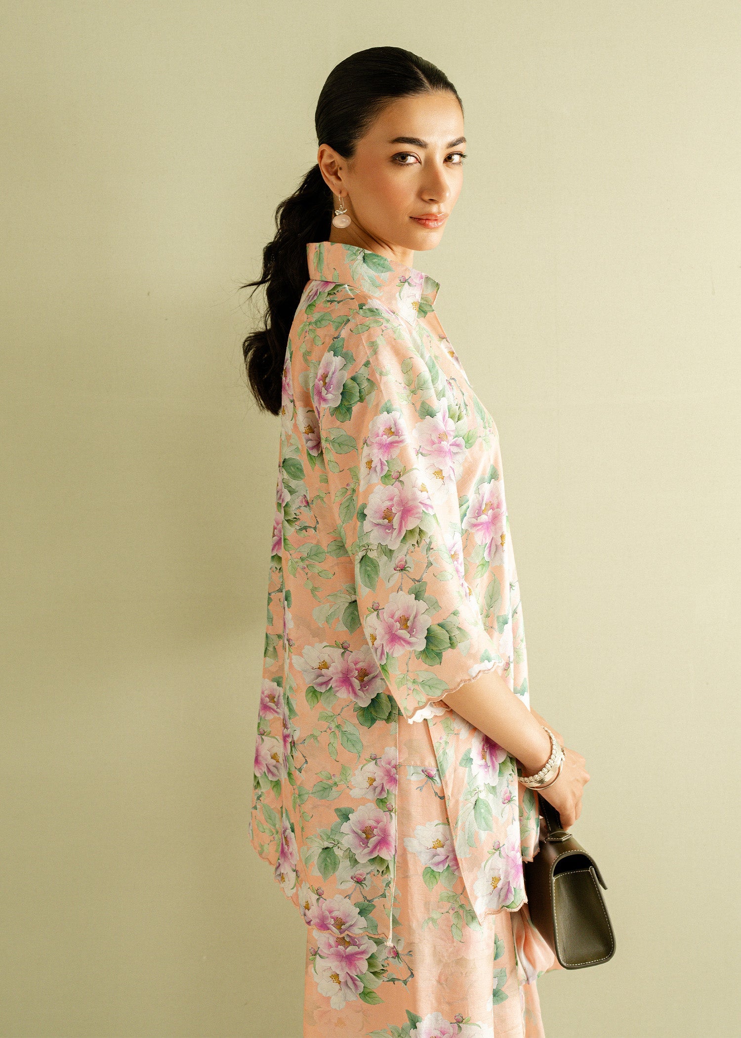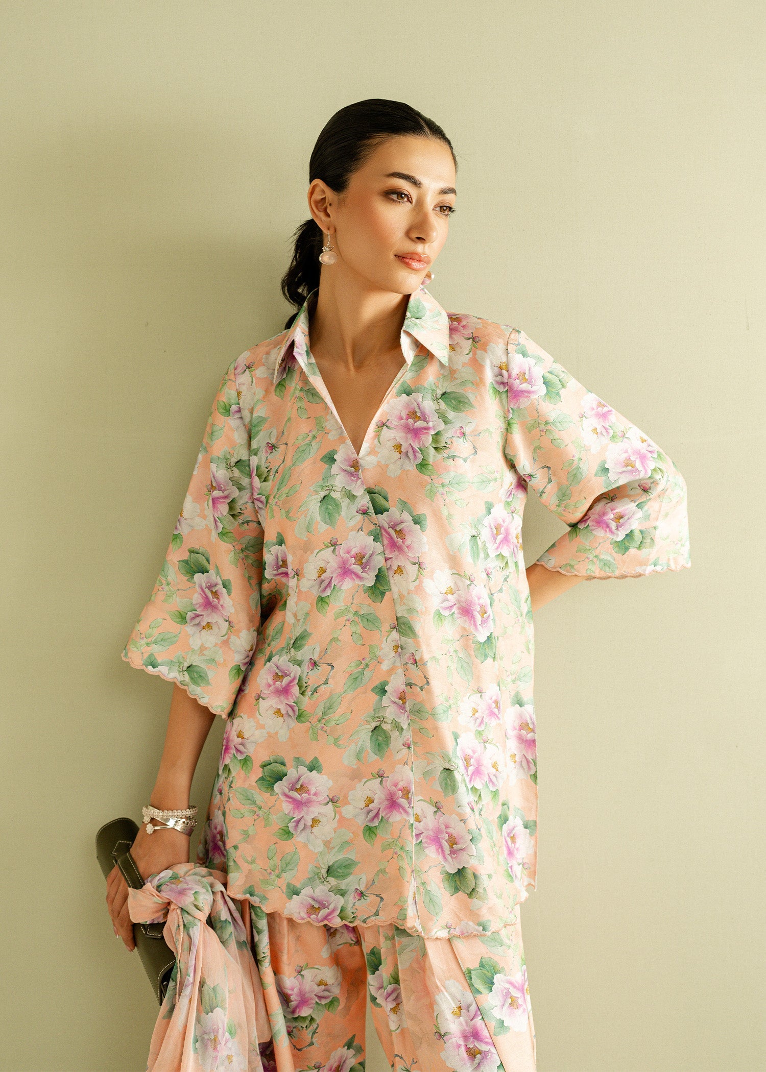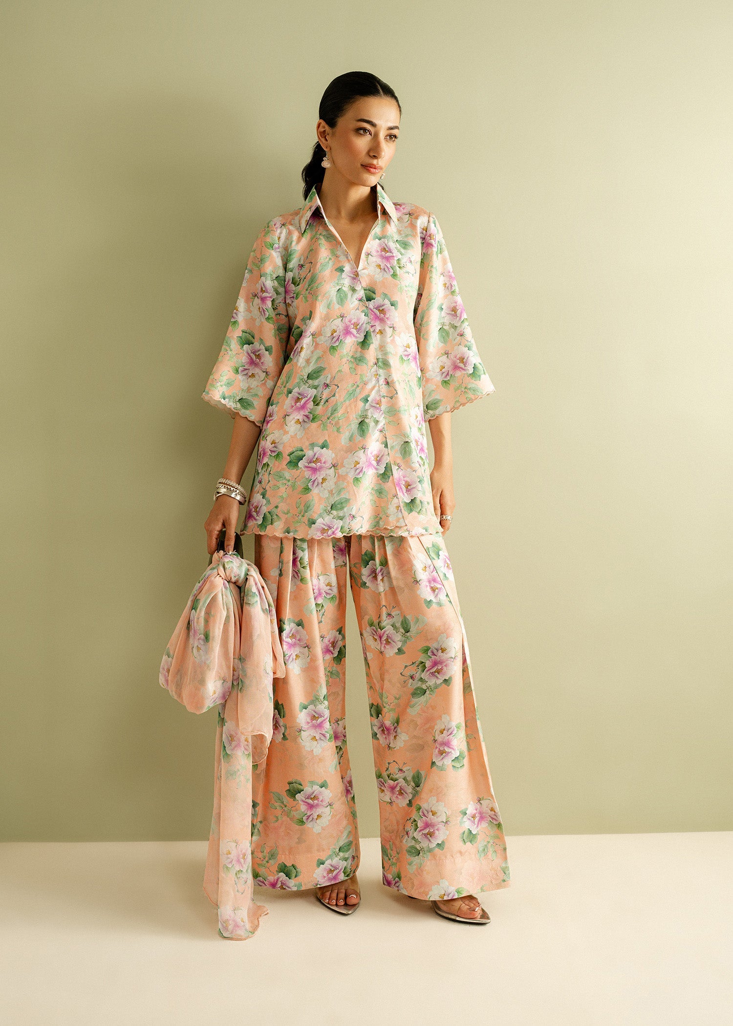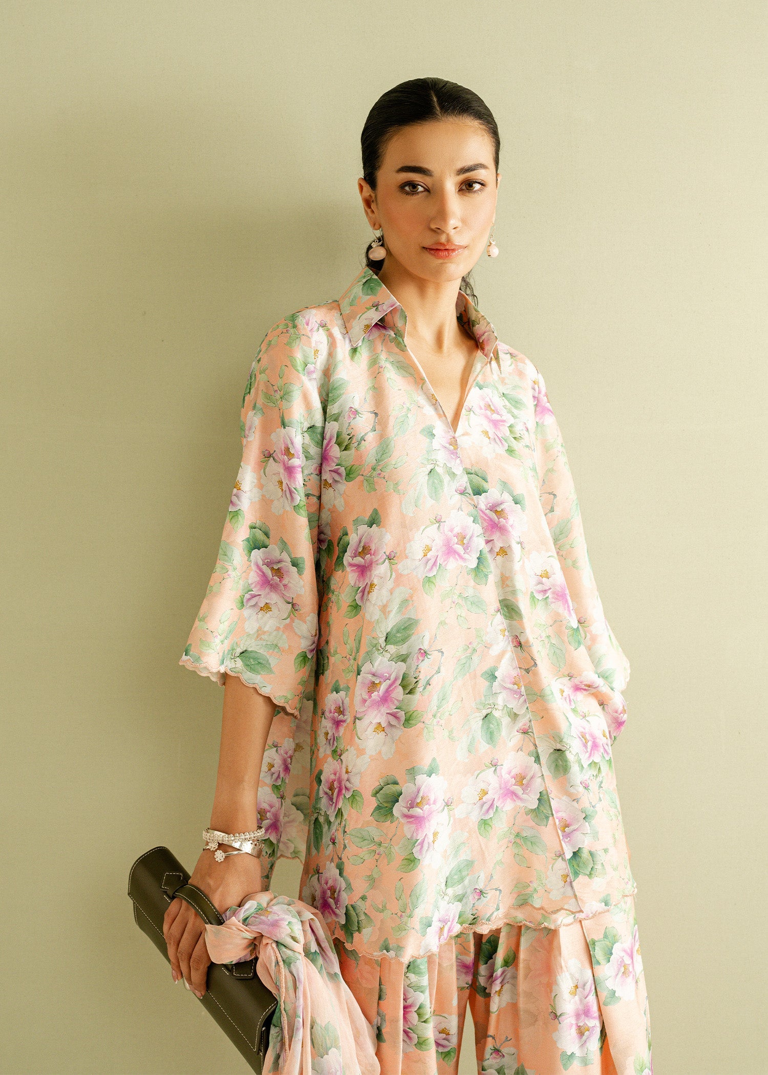 Summer Breeze from Ayana’s Garden — a poetic dance of print and peach-toned elegance. This luxury pret ensemble features a Korean raw silk shirt and trouser set, effortlessly refined in both form and finish. Paired with your choice of a flowing chiffon dupatta — whether plain, misted with spray, or the signature printed version — this look is a gentle ode to sunlit days, soft winds, and timeless charm.