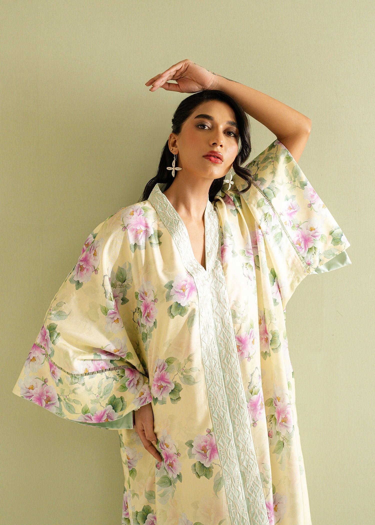 Sun Rose from Ayana’s Garden — a radiant celebration of yellow and print, evoking the warmth of a sun-kissed bloom. The flowing Korean raw silk kaftan paired with printed trousers offers a perfect balance of ease and refinement. This ensemble captures the essence of effortless elegance, making it the ideal choice for those who embrace both vibrancy and grace.